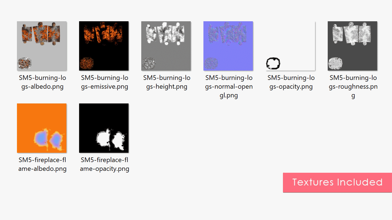 The product contains Albedo, Roughness, Emission, Opacity, Height and Normal map (OpenGL) textures for each material.