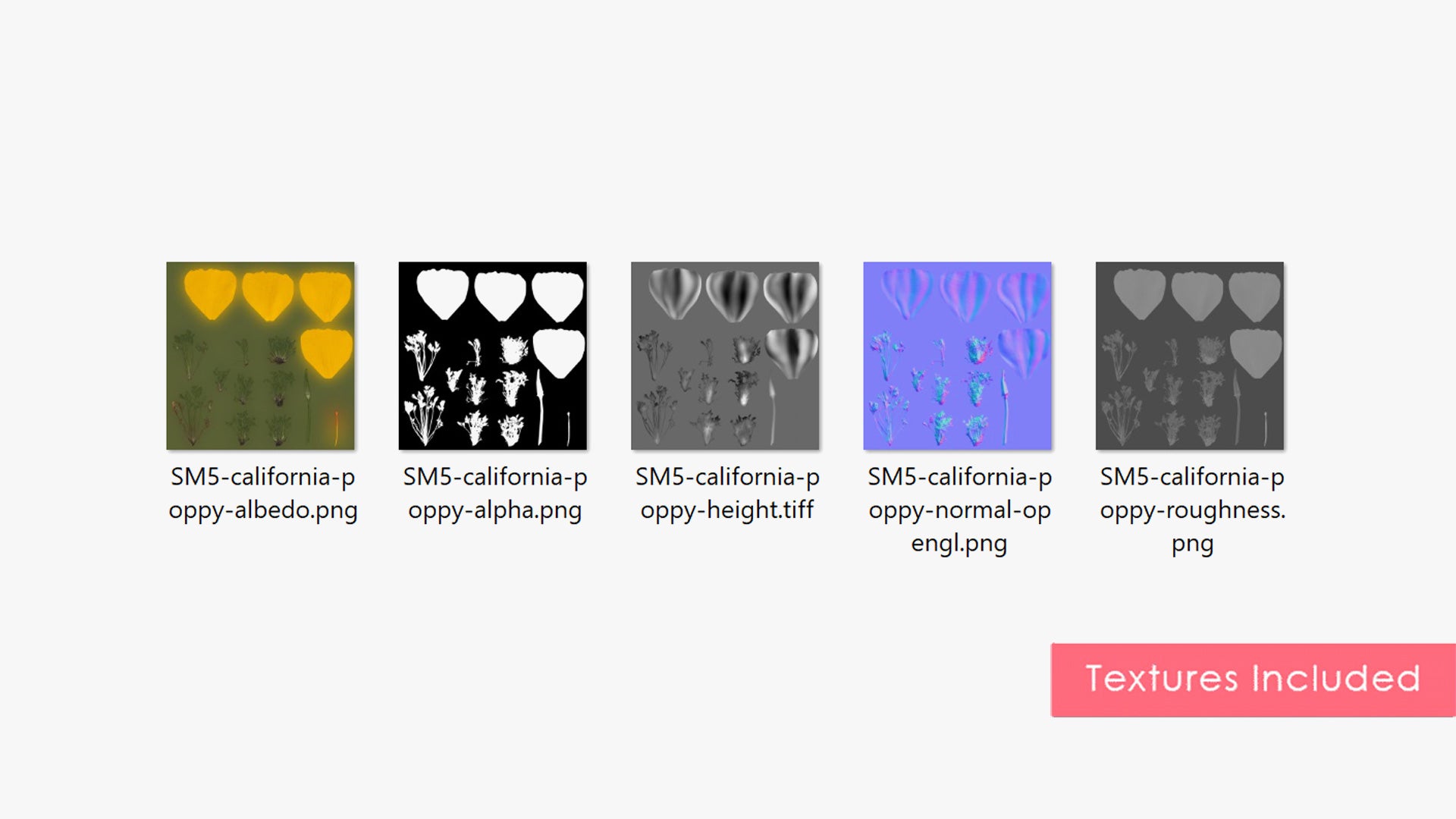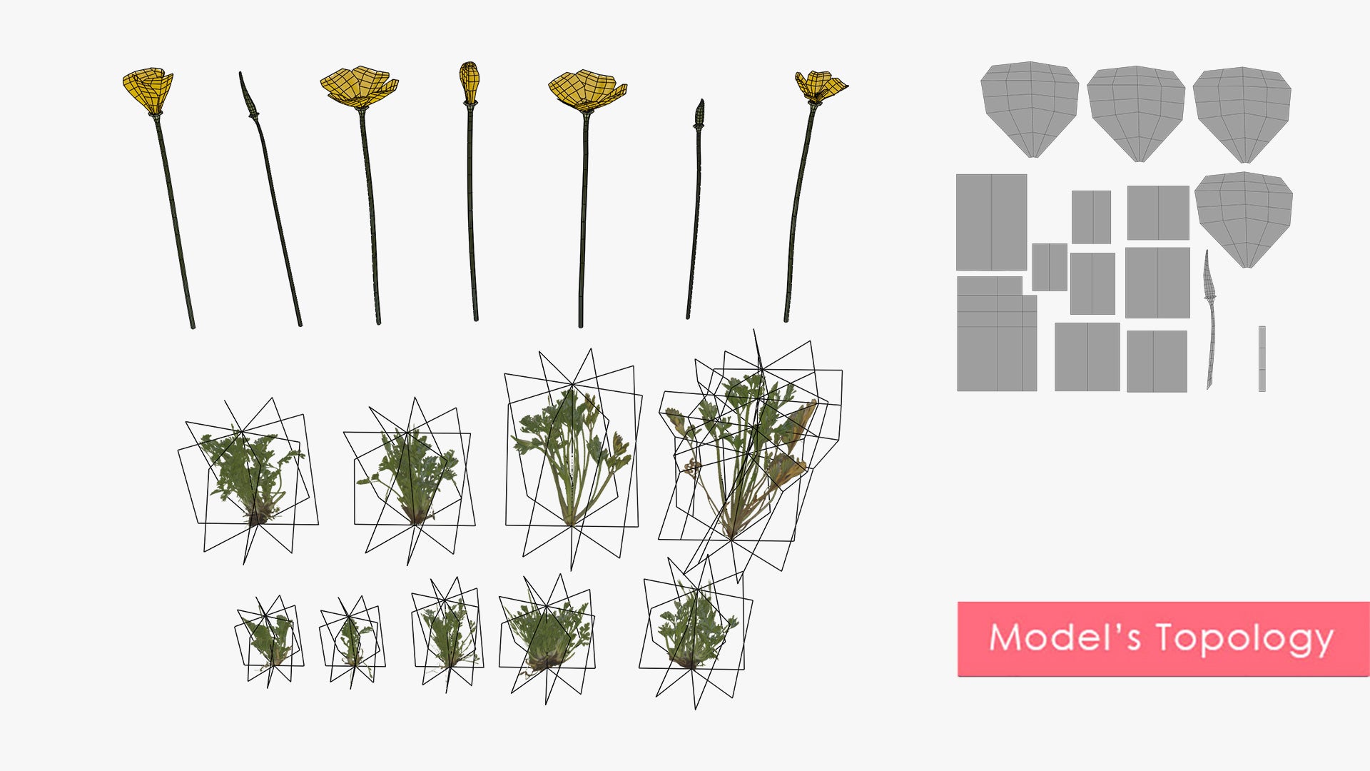 This is a digital 3D model of a customizable field of California poppy. The model contains nine greens, two buds, and five poppies.