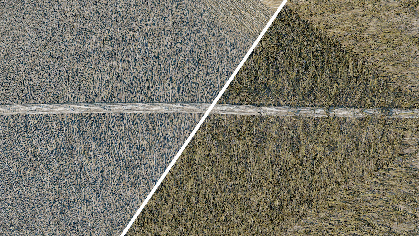 The roof is thatched. For further realism there are mesh cards with dry weeds atop the roof material, and they can be removed for faster rendering.
