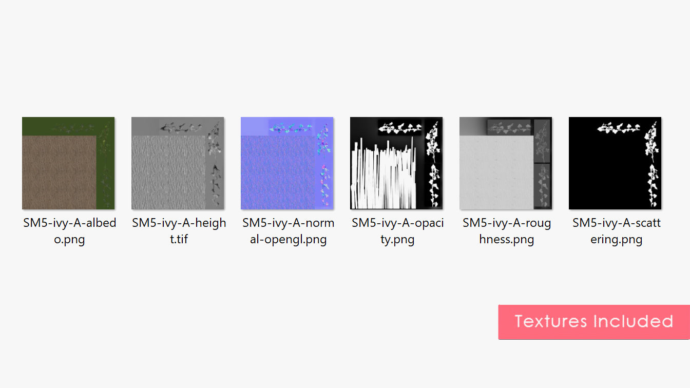 The product contains Albedo, Roughness, Height, Scattering, Opacity and Normal map (OpenGL) textures.