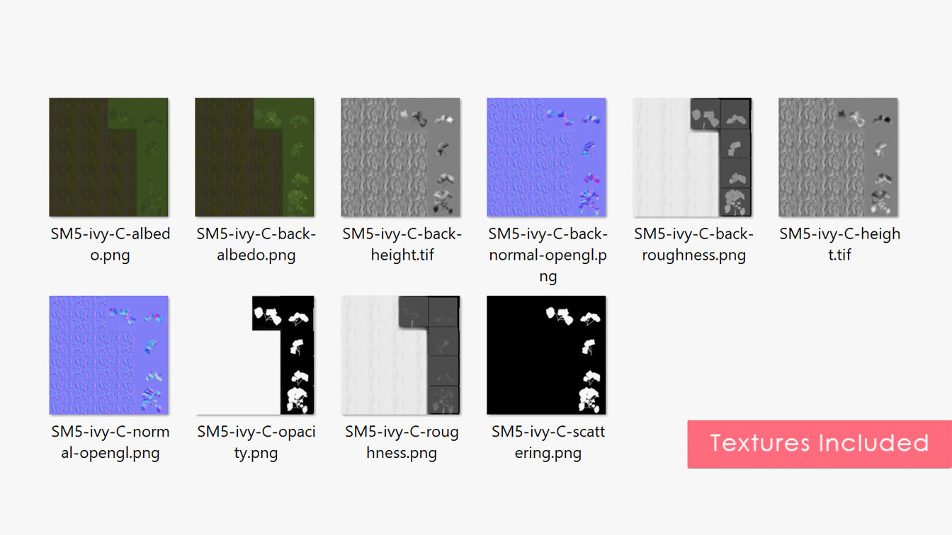 The product contains Albedo, Roughness, Height, Scattering, Opacity and Normal map (OpenGL) textures.