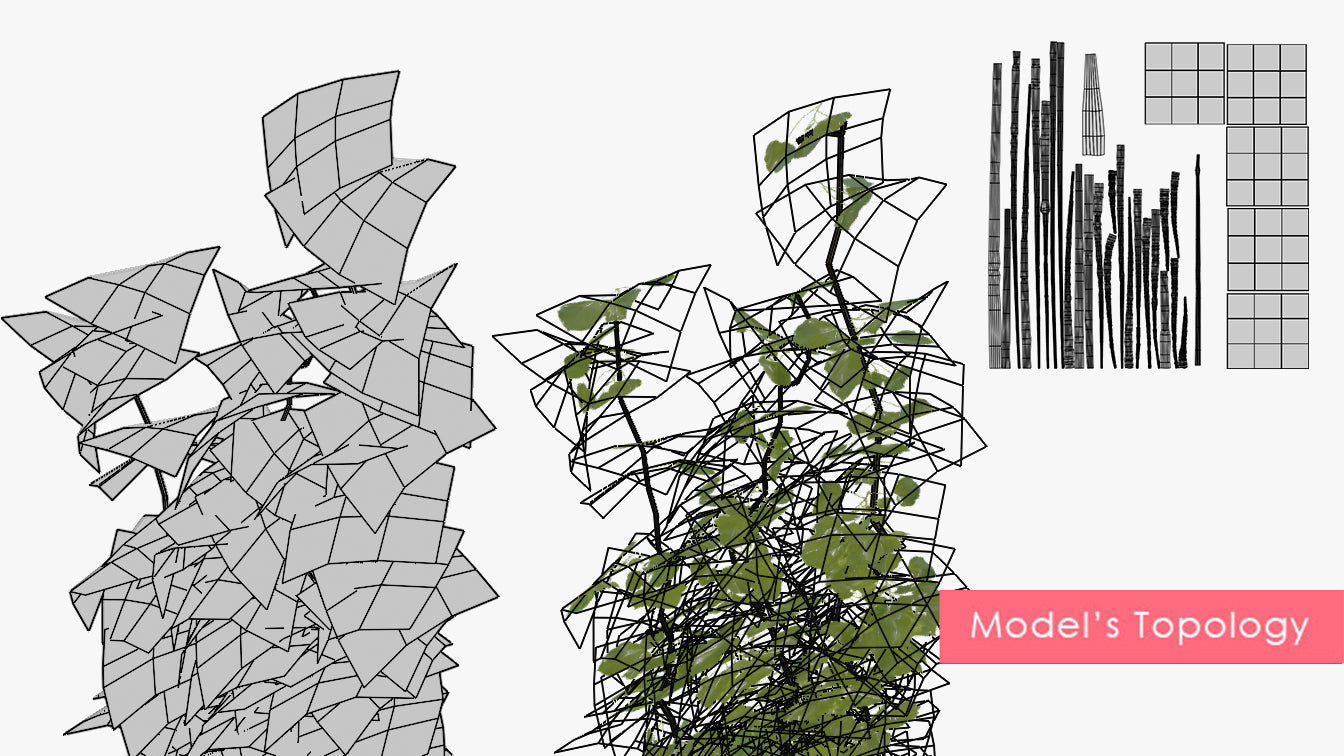 This is a digital 3D model of a creeping ivy plant that grows on a wall. The model has several shape keys (A, B, C, D) that allow for a moderate change in the appearance of the plant. By combining the shape keys, you can achieve a total of 6 varieties.