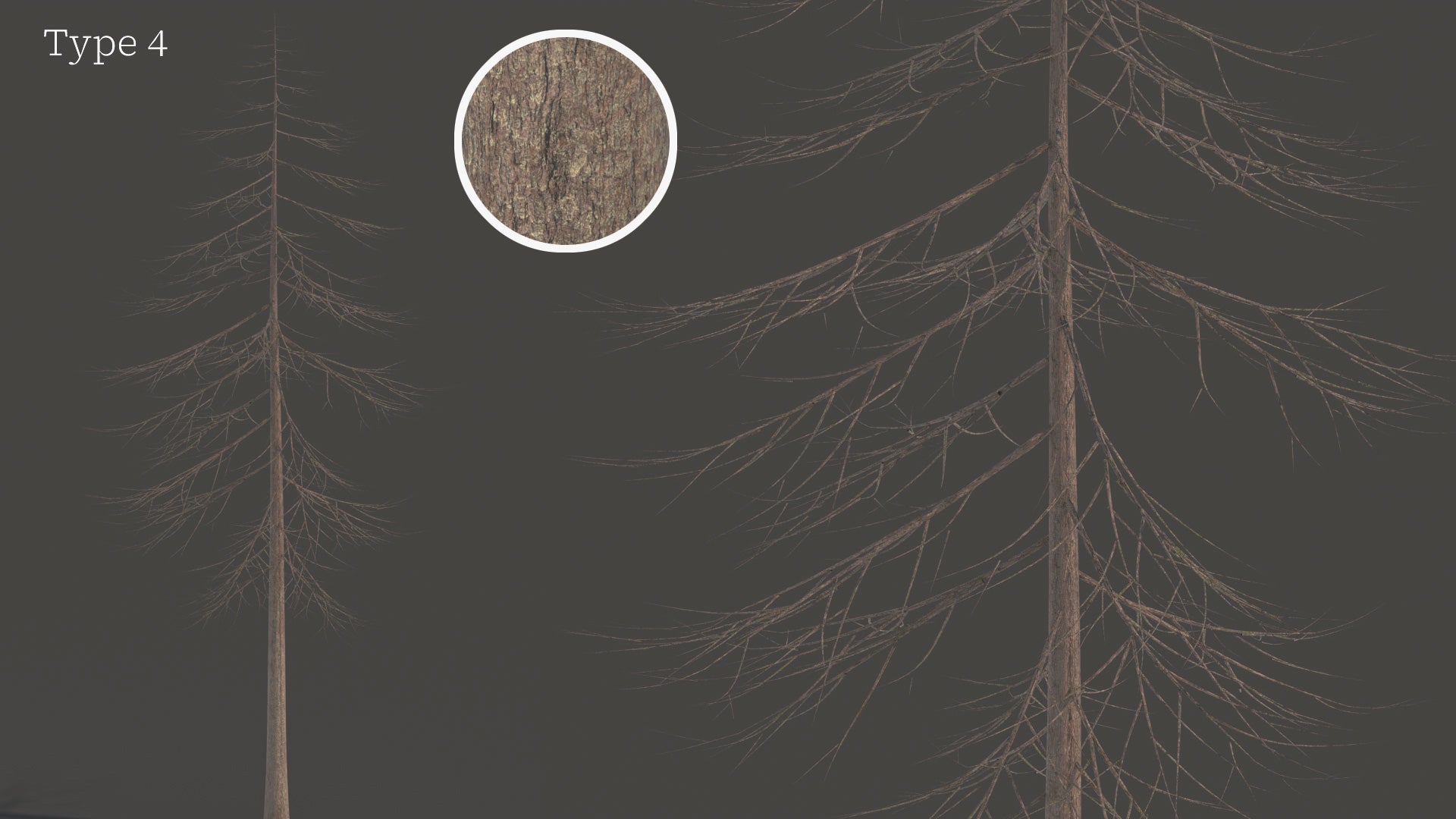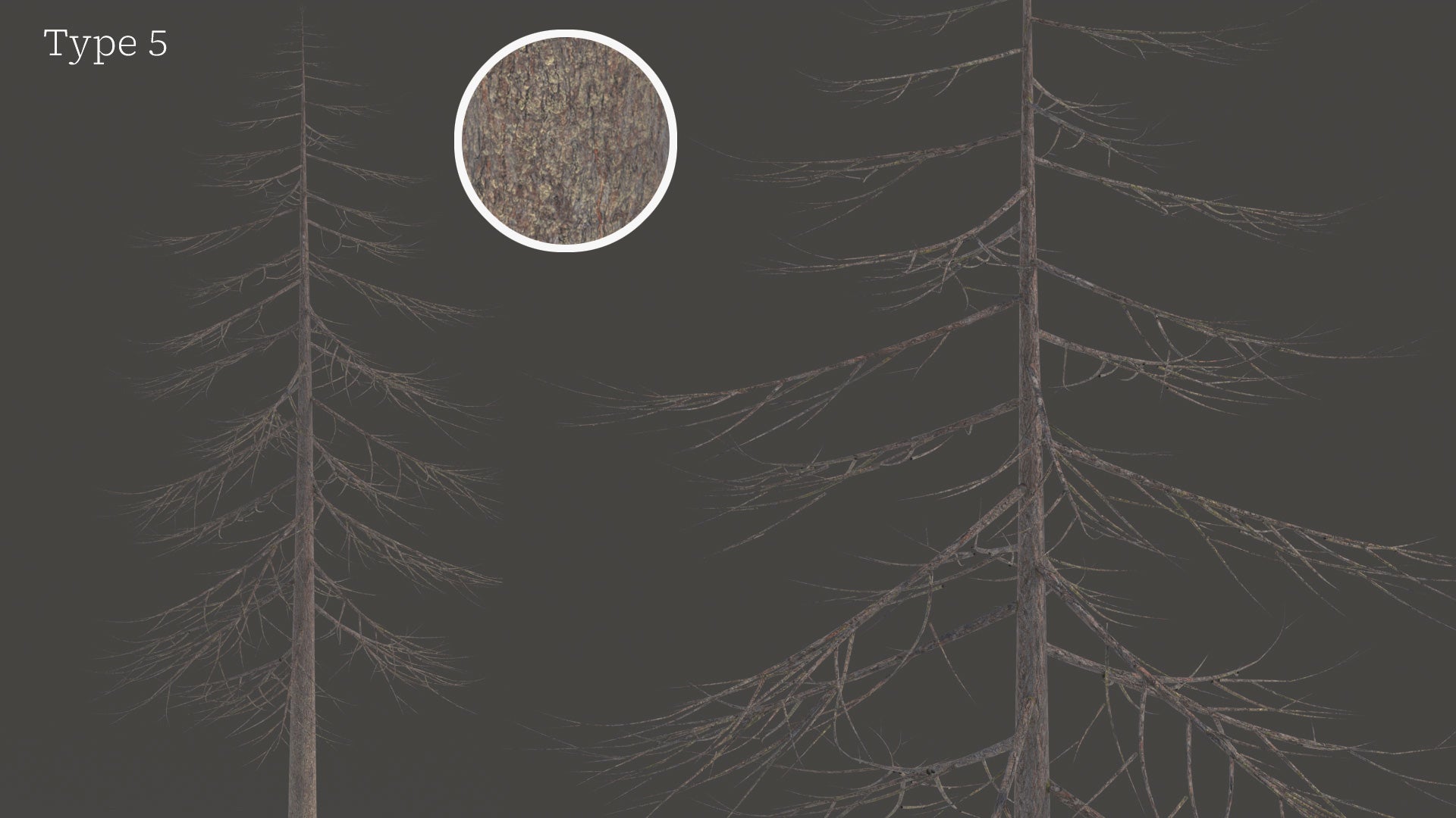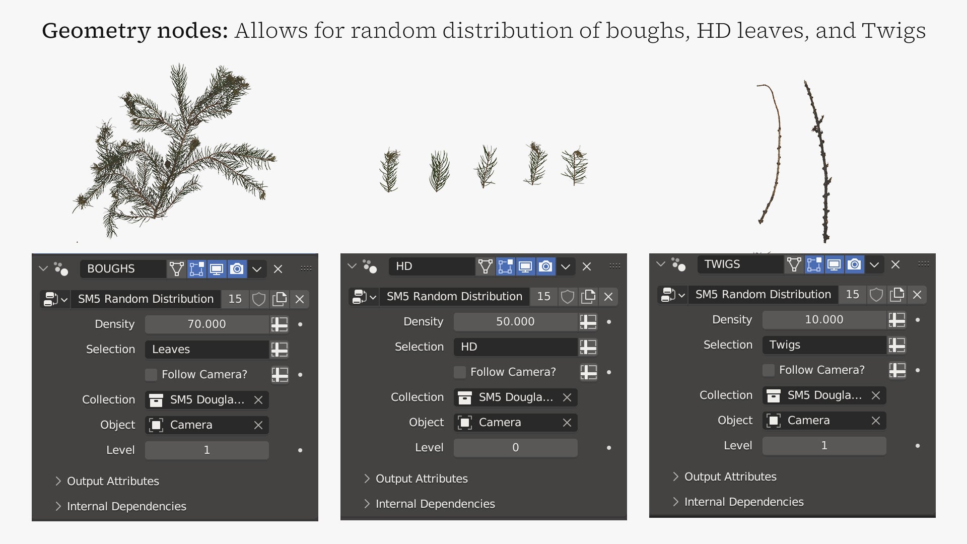 The trees come in five designs with different heights (54m~30m), branch distribution, and bark. The leaves can be increased or decreased in number through a geometry node in the Blender file.
