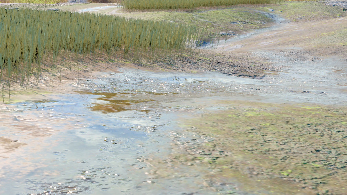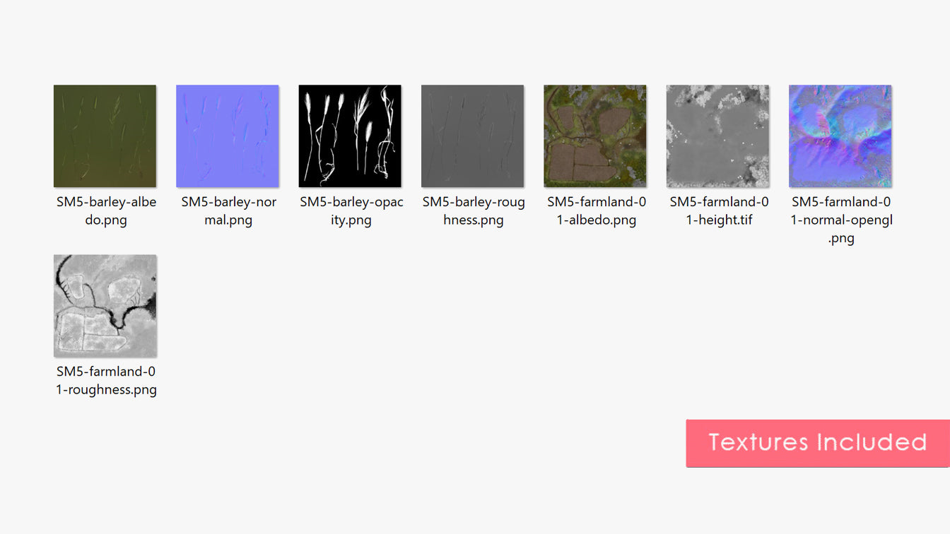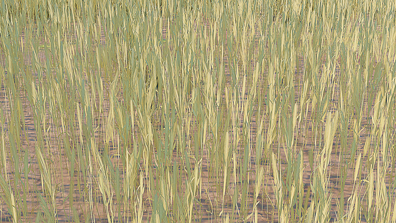 The fields are covered in barley stalks. The stalks are scattered in a random order, with seven different ear shapes. Each group of stalks form one single object for easier manipulation.