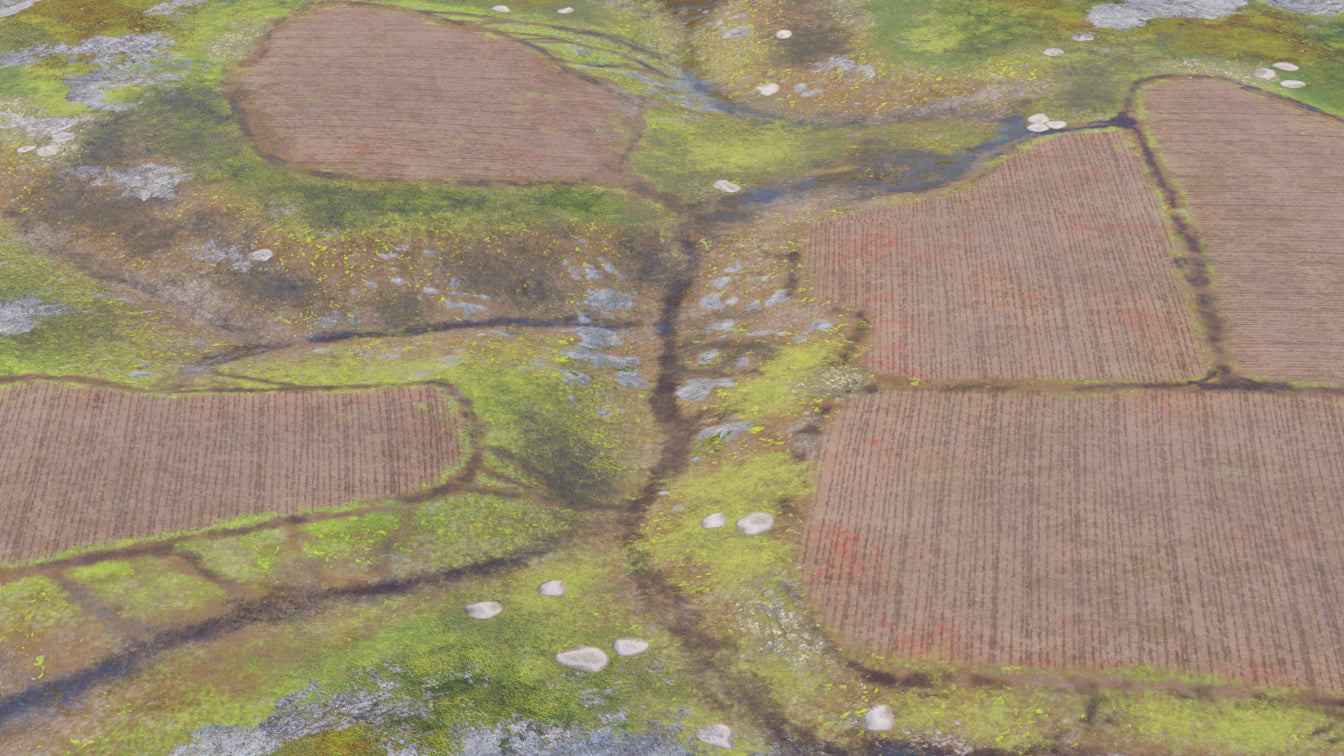 This is a digital 3D model of a farmland terrain. The land has a small gorge at the center with a walking path that is wet at some parts. There are two small fields in the northern side, and a big group of three at the southern.