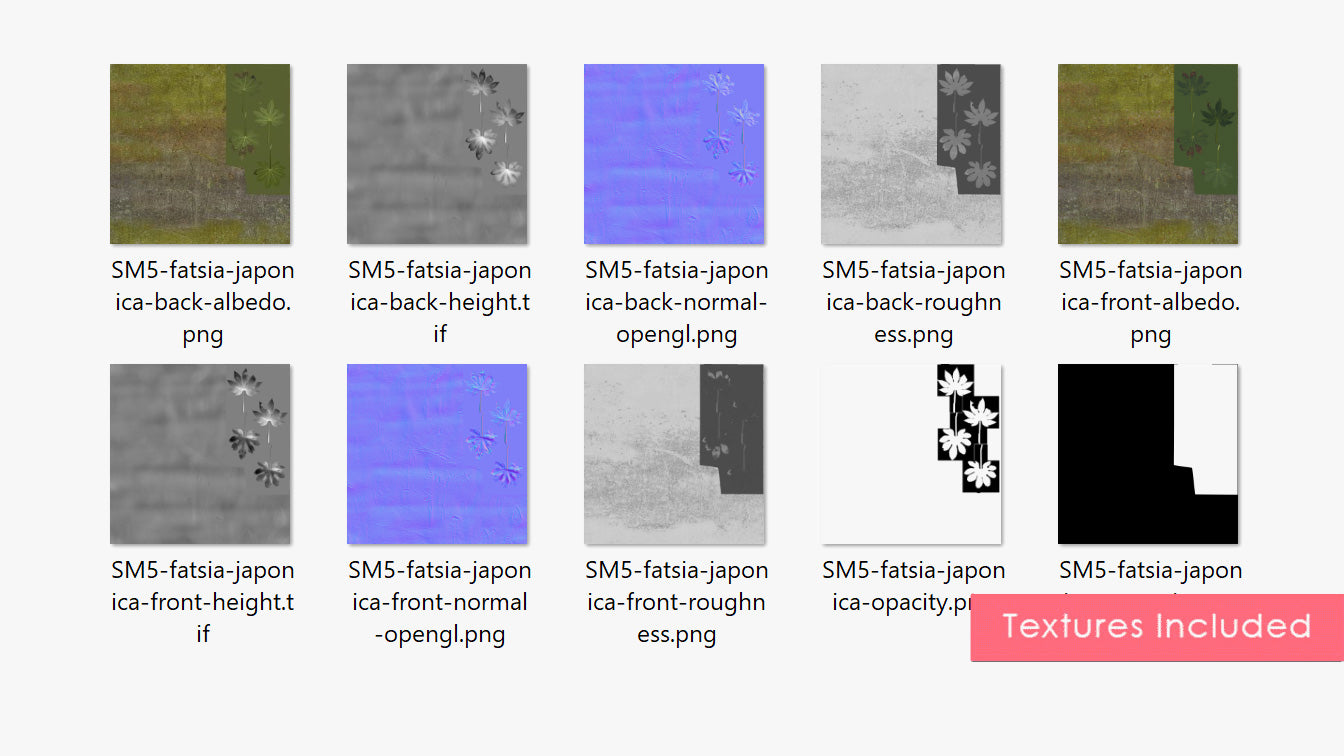 This is a digital 3D model of a Fatsia Japonica plant. It's a large plant with hand shaped leaves that come in four variations: Damaged, eaten, and fresh. The leaves have a material setup that changes the texture depending on the face orientation, allowing for a highly realistic plant with double-sided leaves.