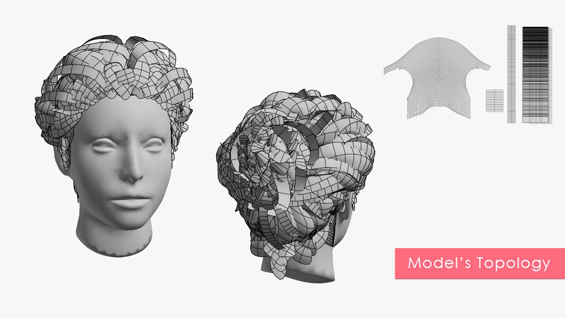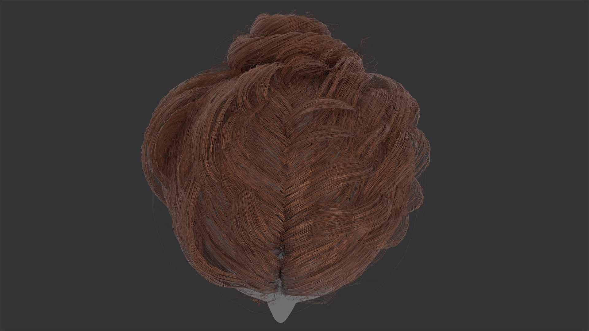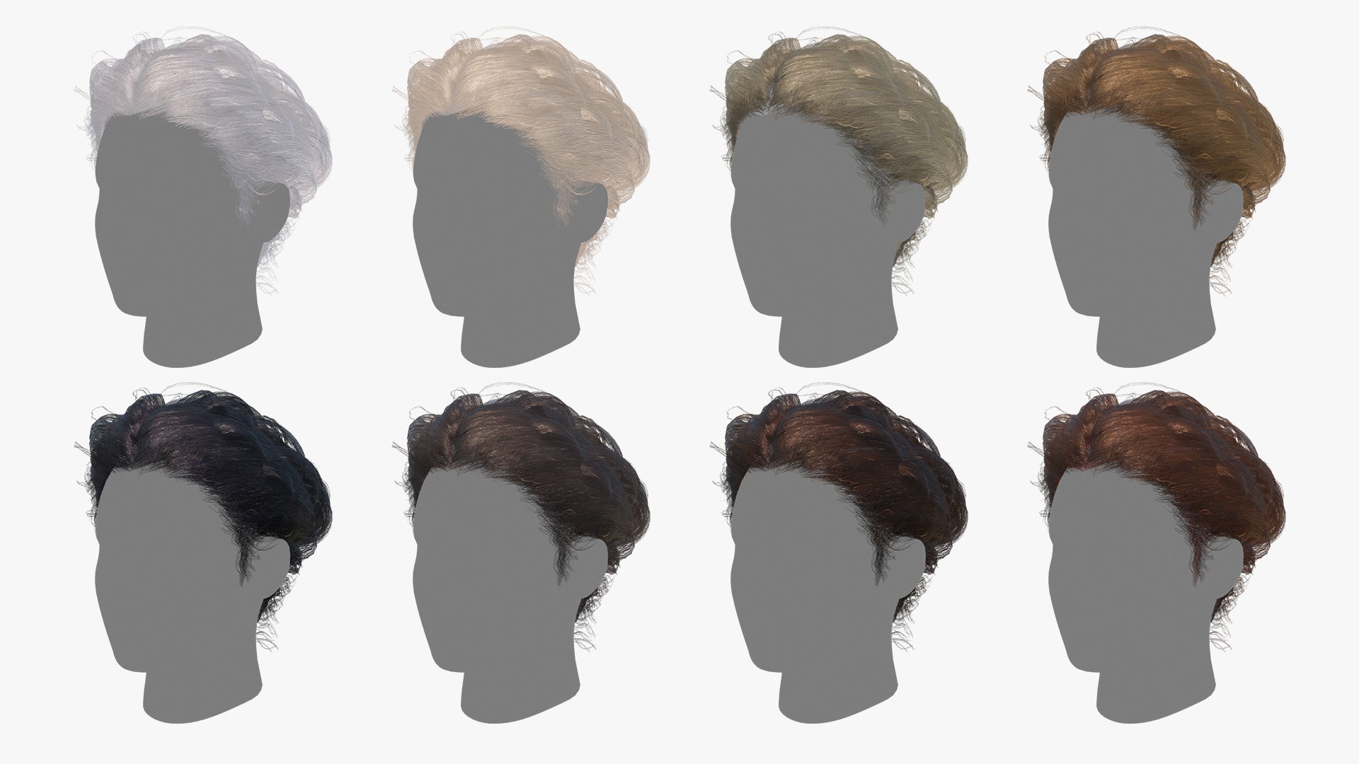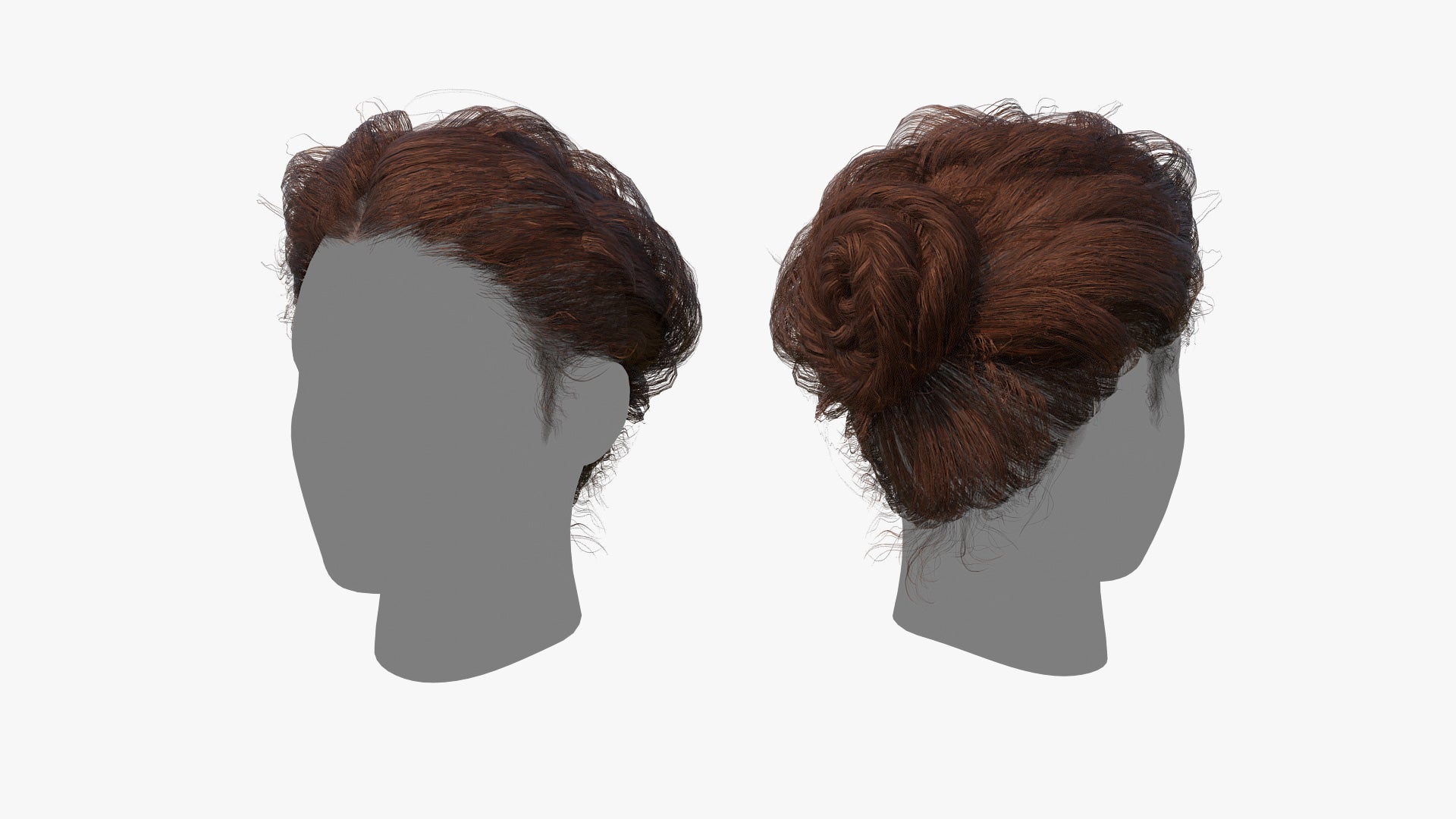 This is a digital 3D model of an old-fashioned hairdo of curly hair decorated with a fishtail braid bun, made of mesh cards. The result is perfect for real-time characters.