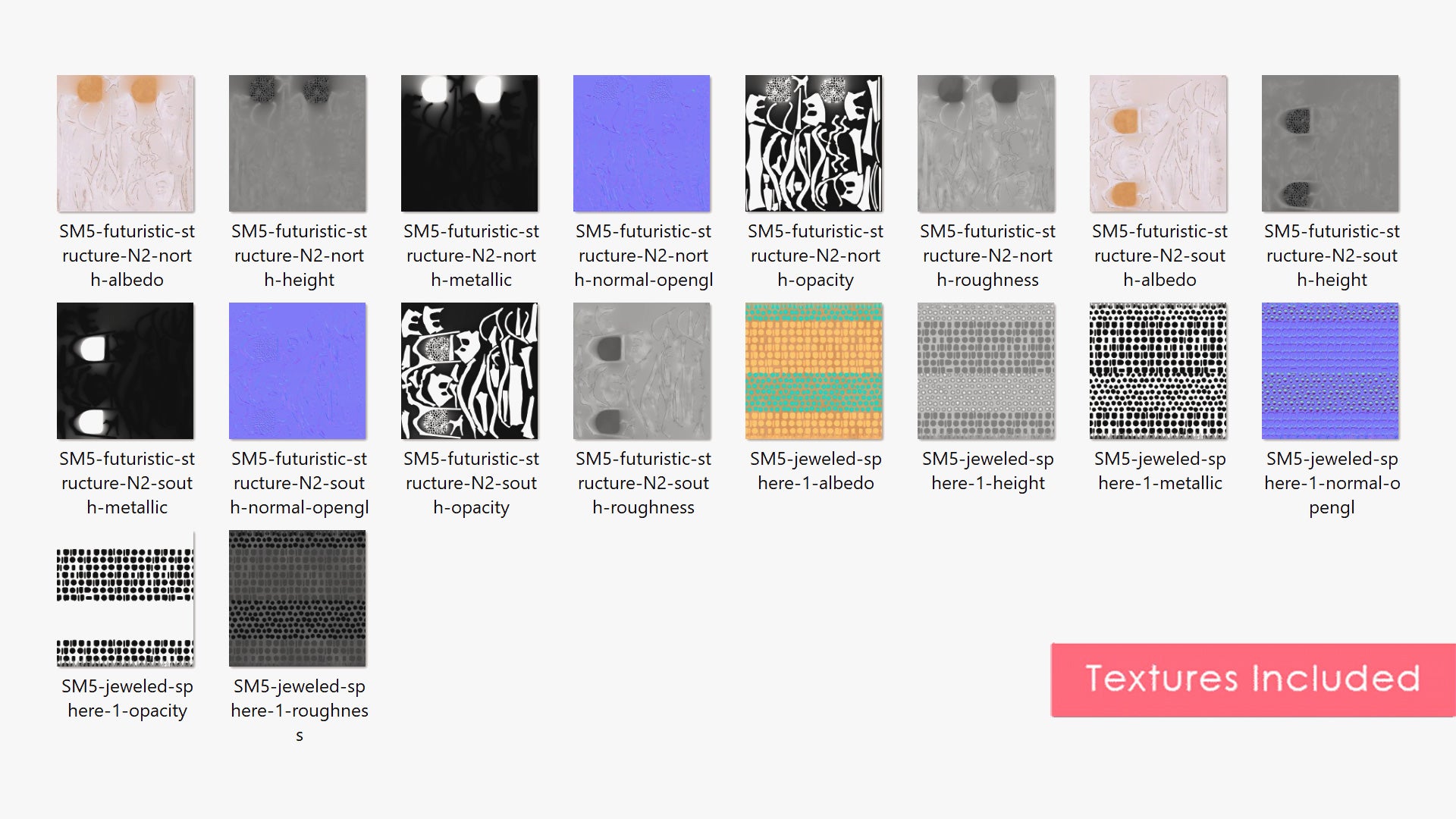 The product contains Albedo, Roughness, Metallic, Opacity, Height, and Normal map (OpenGL) textures.