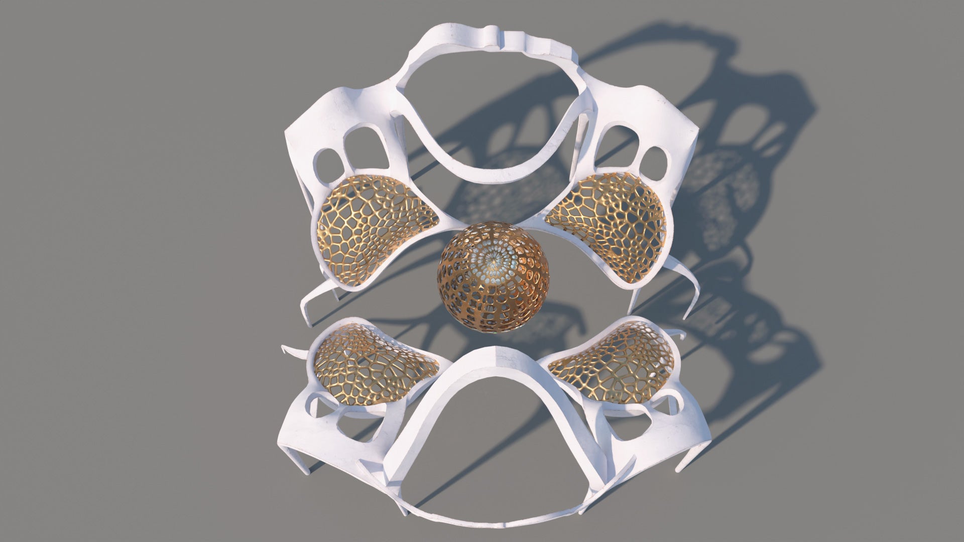 This is a digital 3D model of a modern futuristic structure. Organic columns and arches surround a floating jeweled sphere that float in mid-air. The structure is made of wood and covered in white plaster. Details of the wood can be seen at the edges.