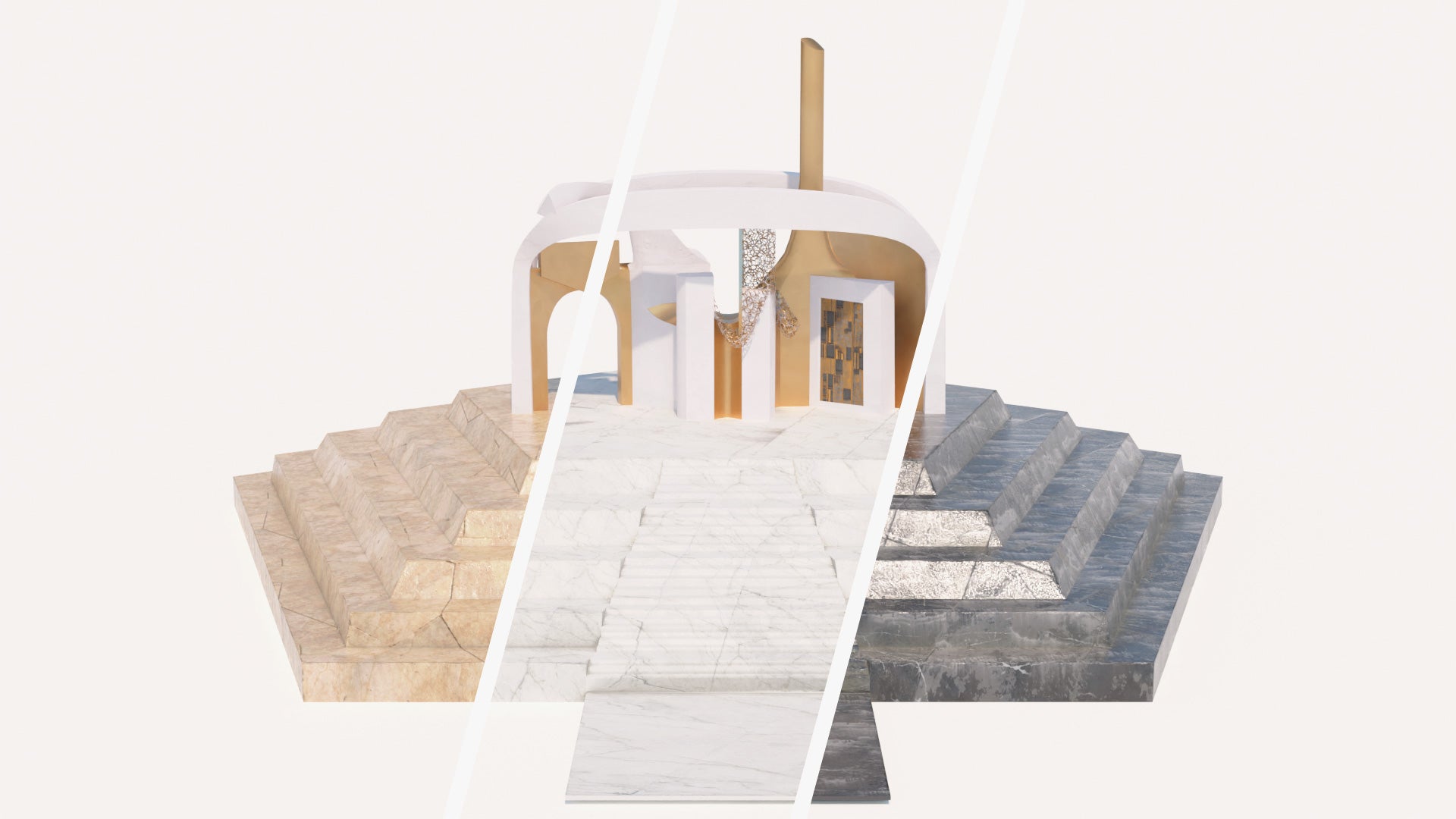 This is a digital 3D model of a modern futuristic structure. Atop pyramidal pentagonal stairs there's a wall with arched doors and a Klimt style painting. There is also a column made of golden mesh.