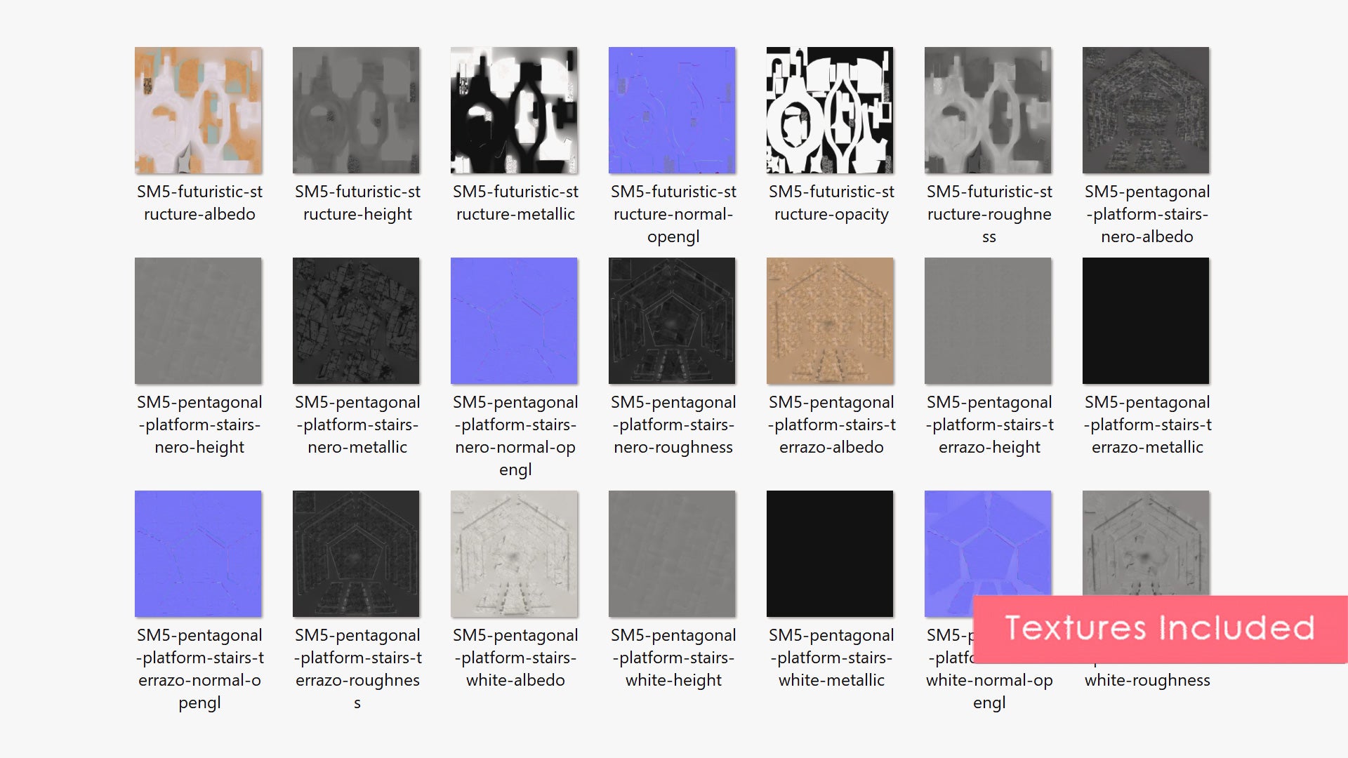 The product contains Albedo, Roughness, Metallic, Opacity, Height, and Normal map (OpenGL) textures.