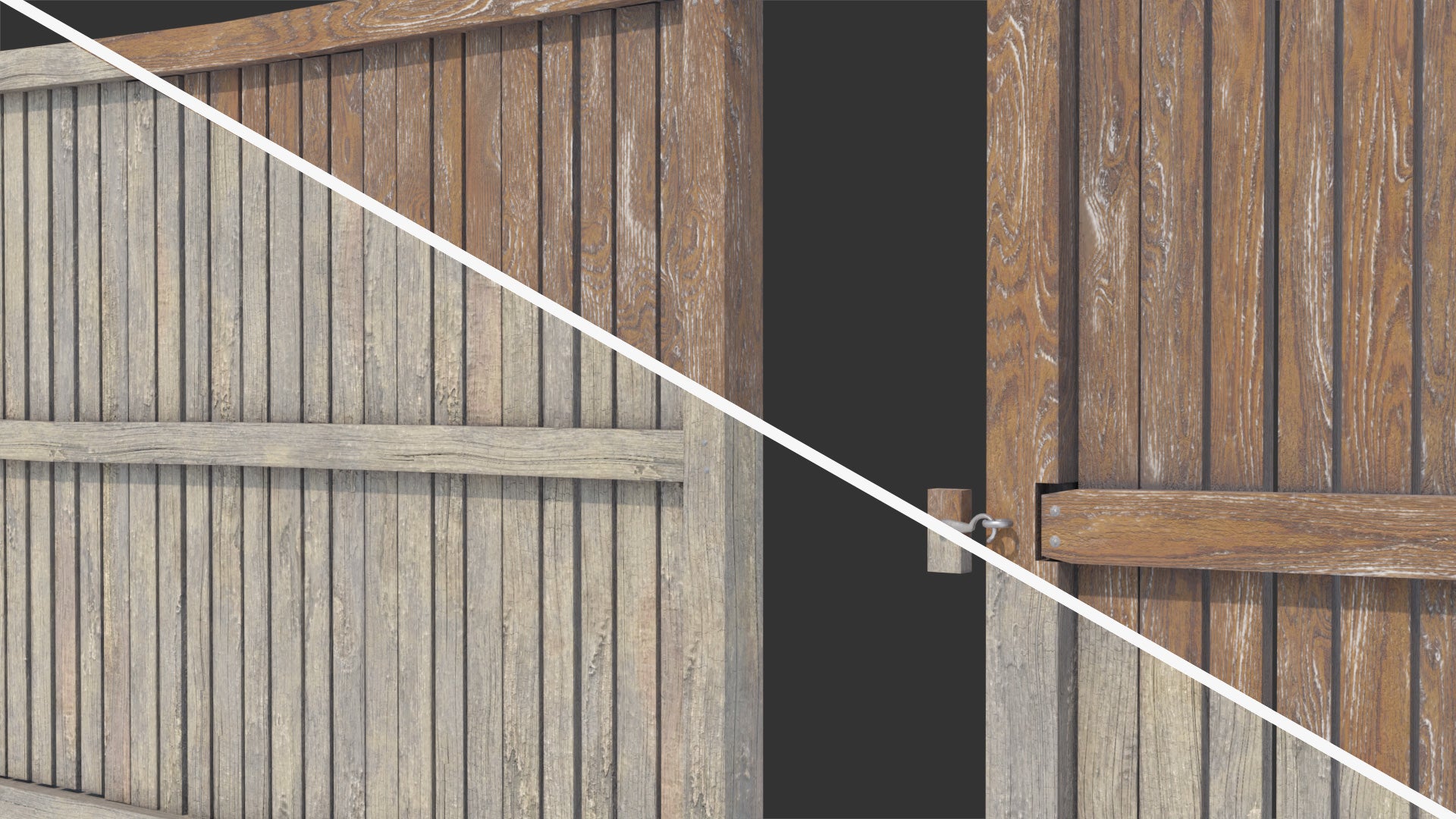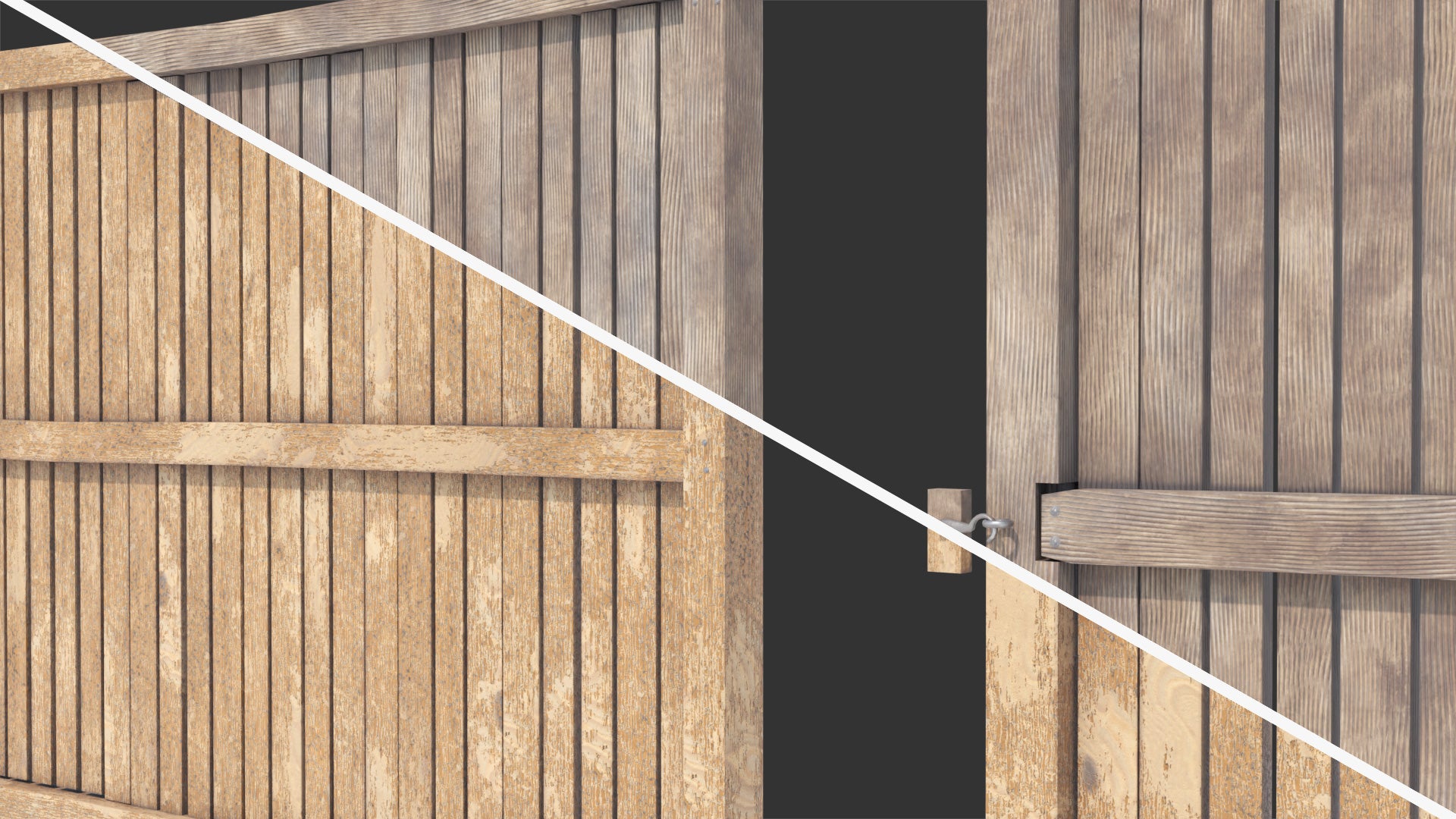 This is a digital 3D model of a Galician horreo window and door made of wood, with rusty metal hinges, and a door lock.