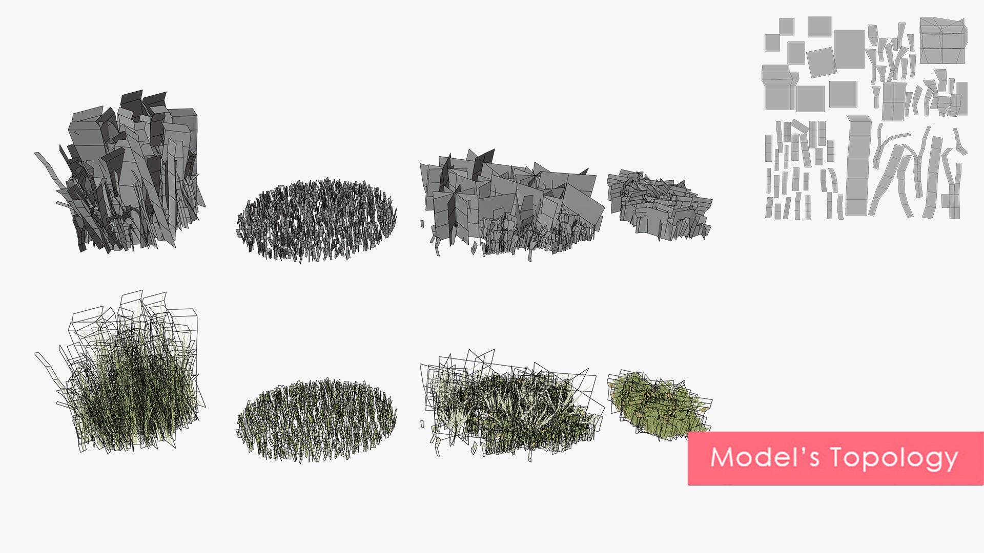 The grass is made out of mesh cards with a transparency shader. Perfect for real-time renders.
