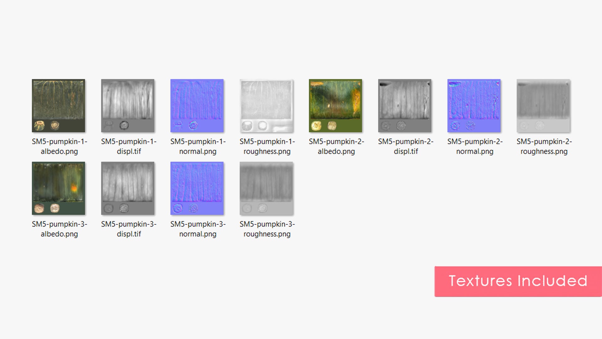 The textures can be interchanged between the models, allowing for a great variety of pumpkins. They can also be exchanged with the materials from our products Halloween Pumpkins and Orange Pumpkins for an even greater variety!