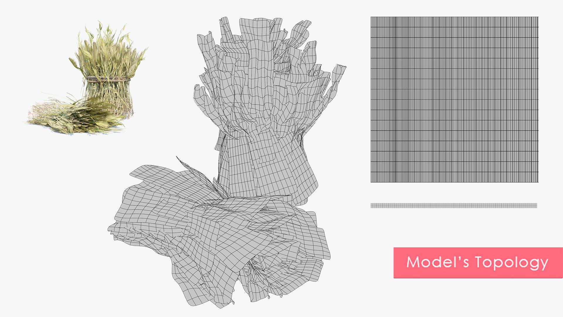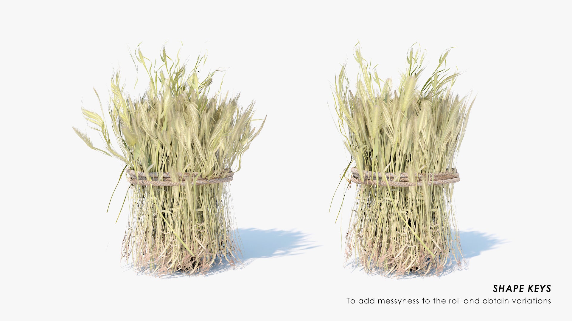This is a digital 3D model of a pile of harvested barley and a roll. The roll is tied with a rough handmade rope, and it has a shape key to control the amount of messiness.