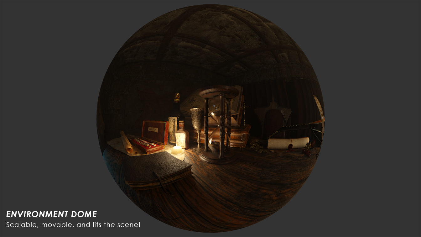 This product is an HDR Equirectangular image of a medieval desk scene full of interesting antique objects all lit by candlelight. This image is perfect for rendering objects set on the table surface, receiving amazing reflections of the surroundings.