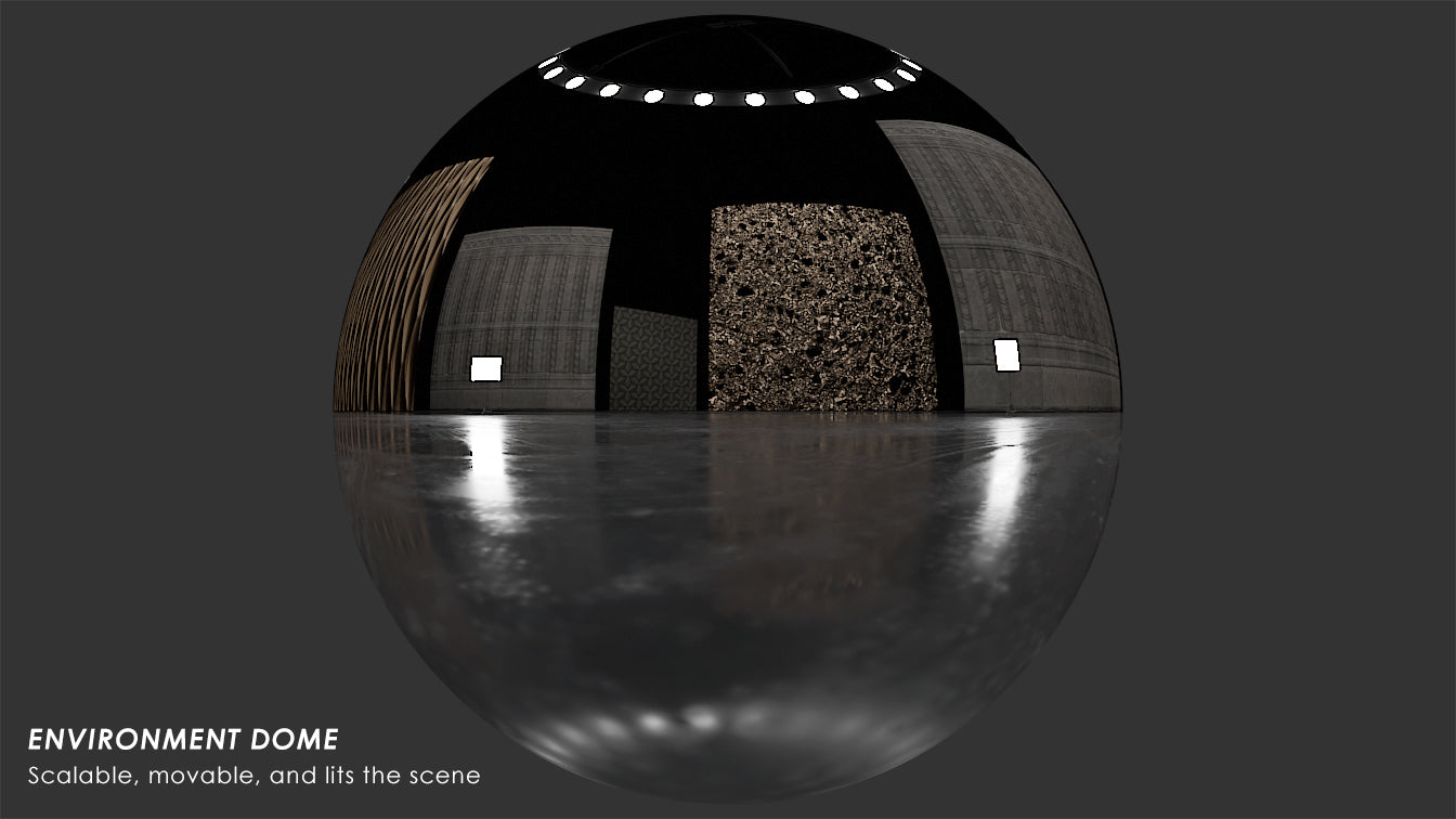 The design of this HDRI consists of a vast environment surrounded by panels shaded in dark, interesting materials. The contrast between textures and light makes this dome a perfect choice for character and product representation.