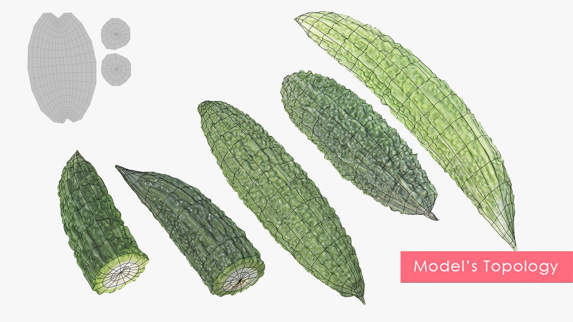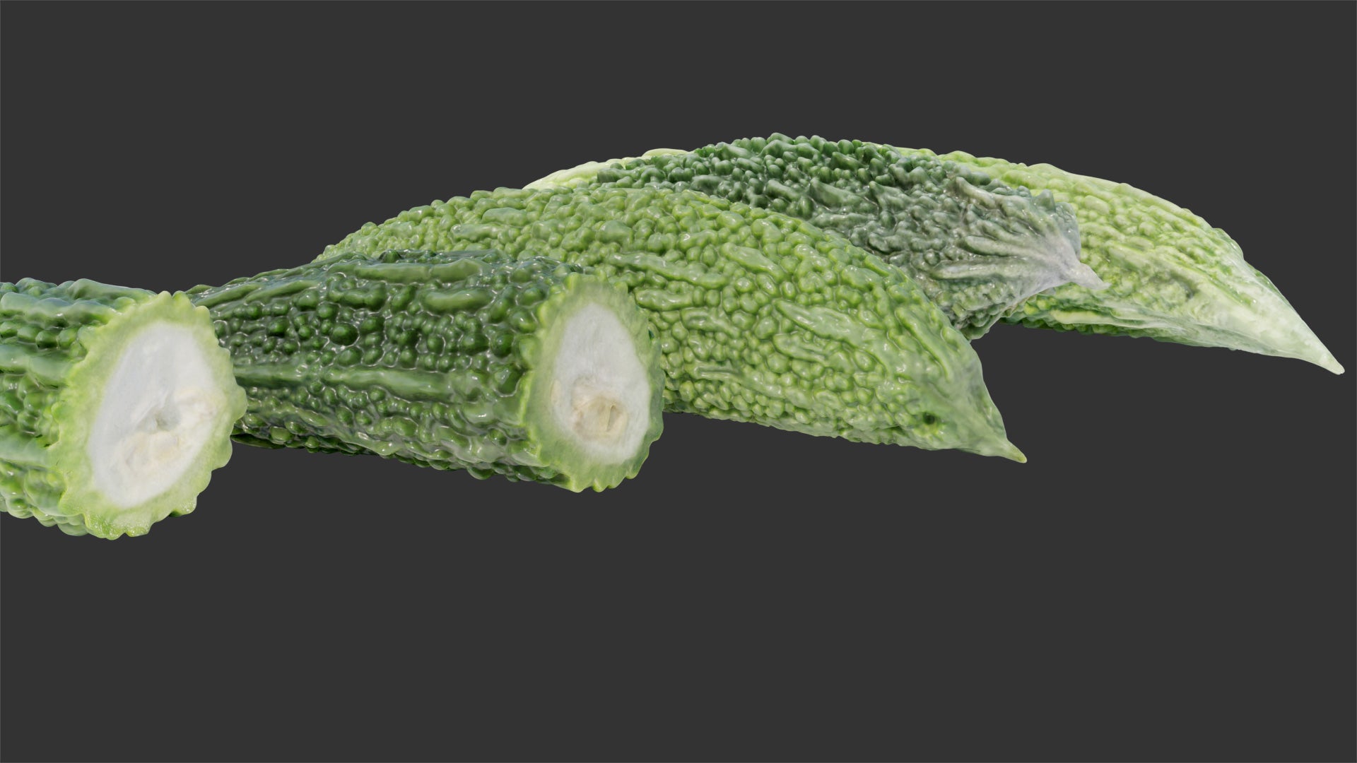 This is a digital 3D model of five bitter gourds of the Japanese variety (nigauri, goya), scanned and retopologized from real fruits. The resulting models have an excellent quality and detail, while maintaining a very small poly count.