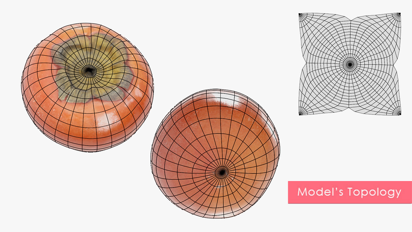 This is a digital 3D model of three Japanese persimmons. The persimmons have been scanned and retopologized from three real fruits, and the resulting models have an excellent quality and detail, while maintaining a very small poly count.