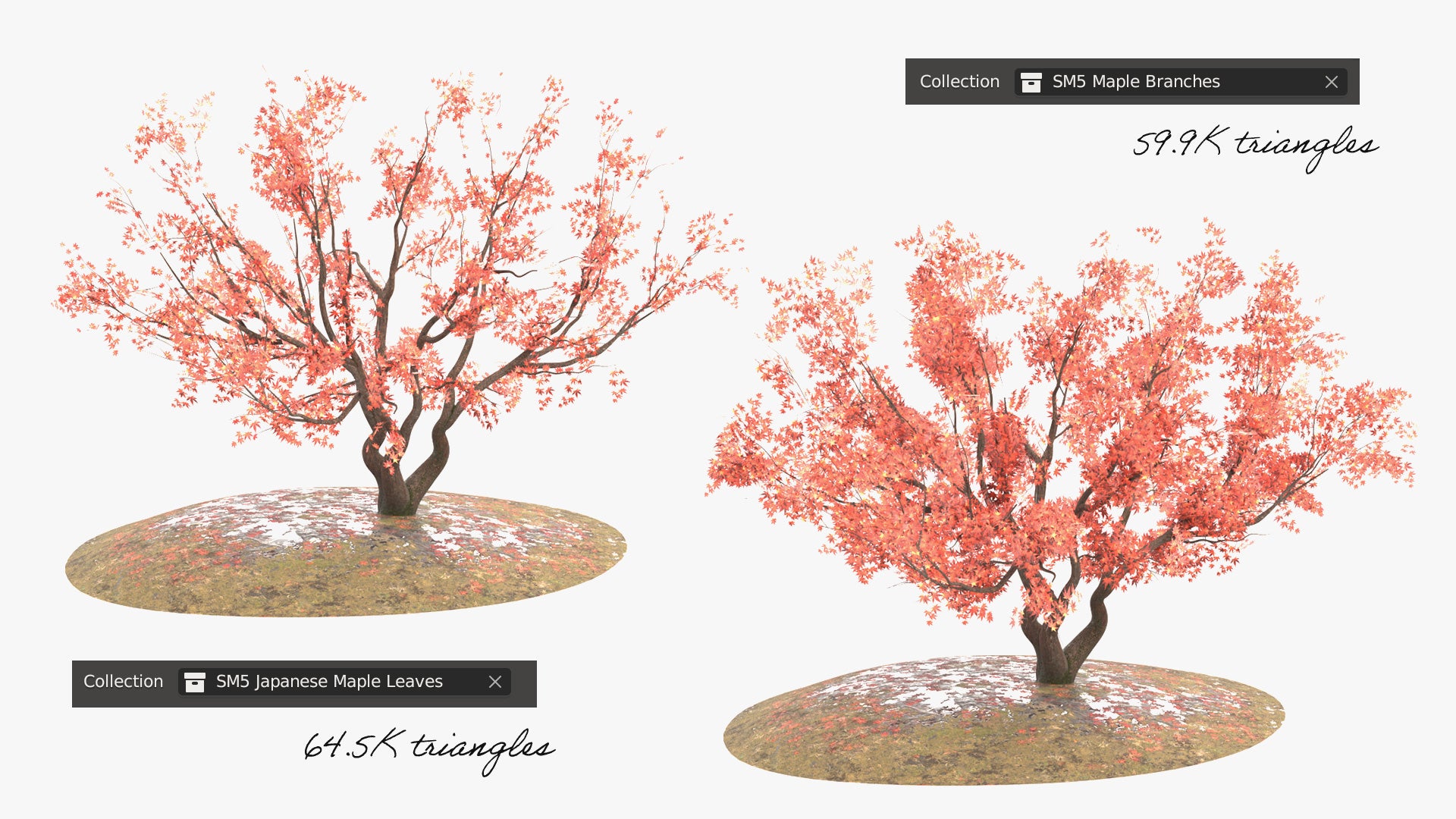 This is a digital 3D model of a collection of three Japanese red maple trees (Momiji).
