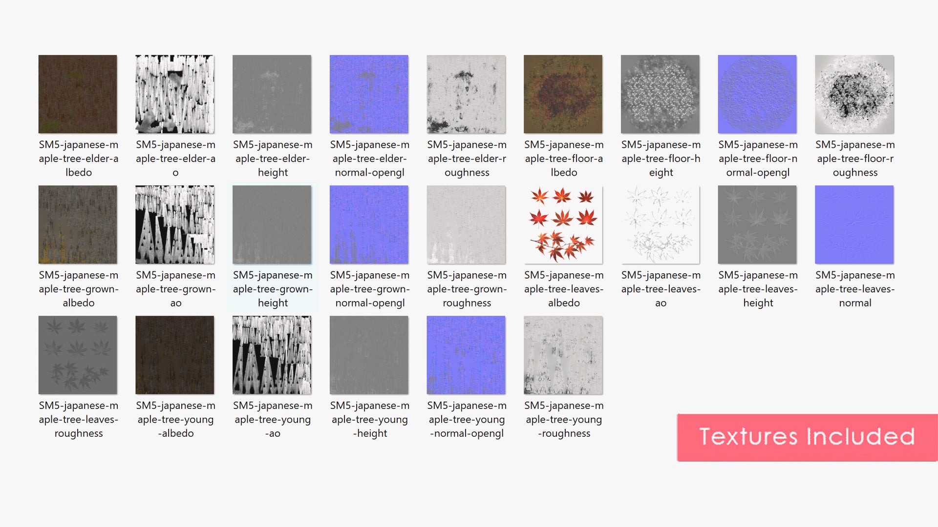 The product contains Albedo, Roughness, Height, Opacity, AO, and Normal map (OpenGL) textures.