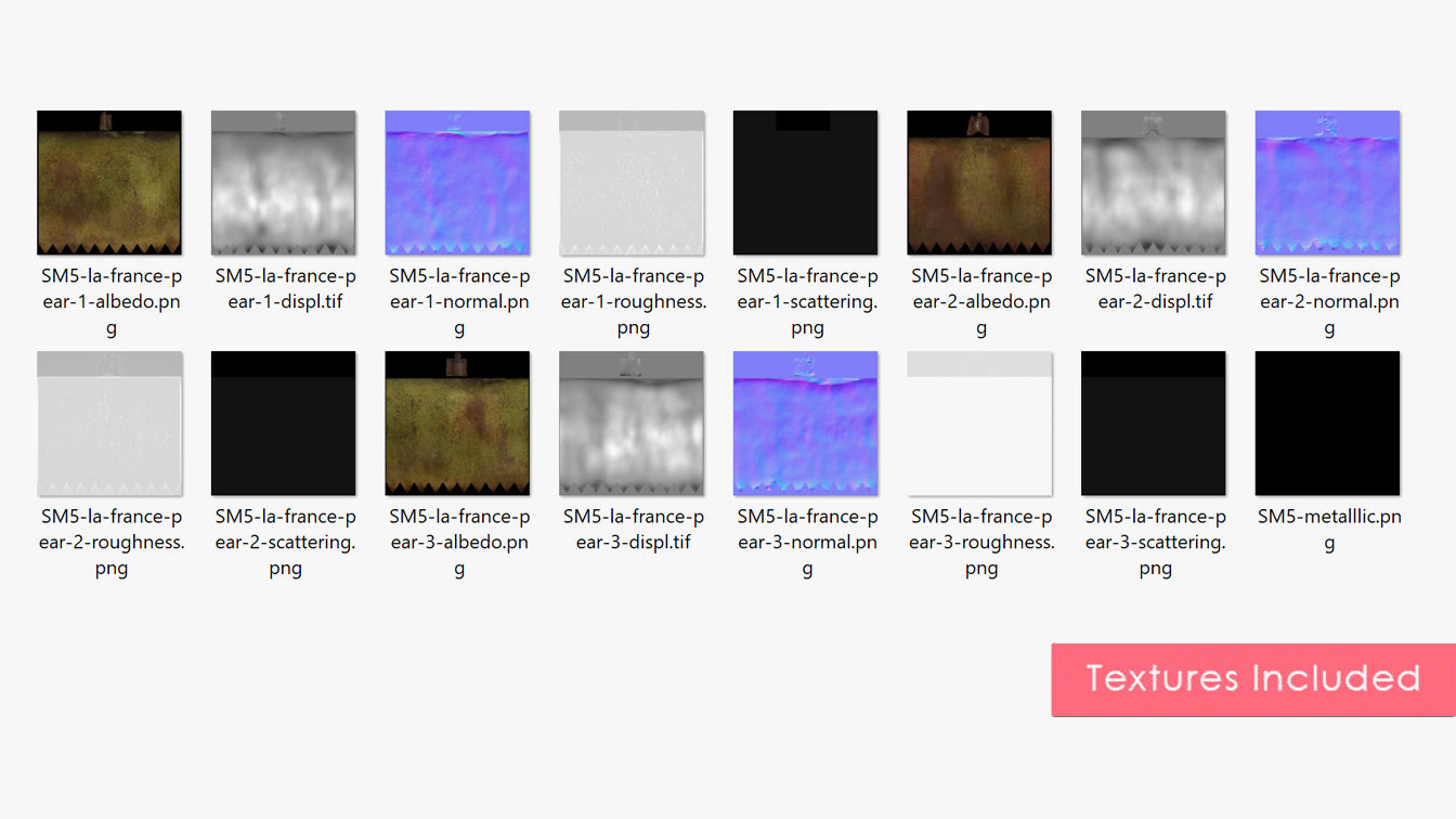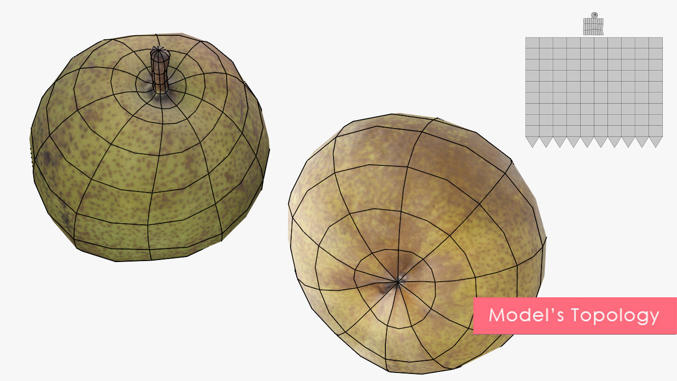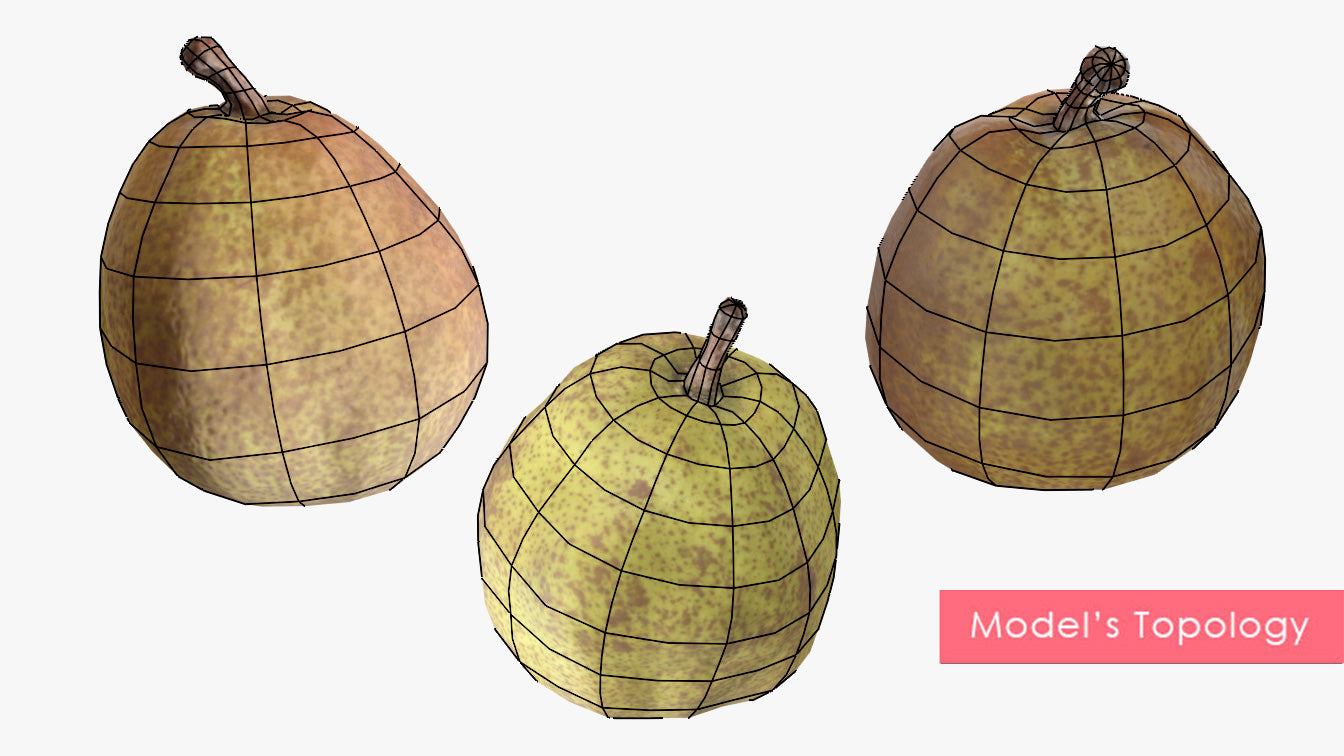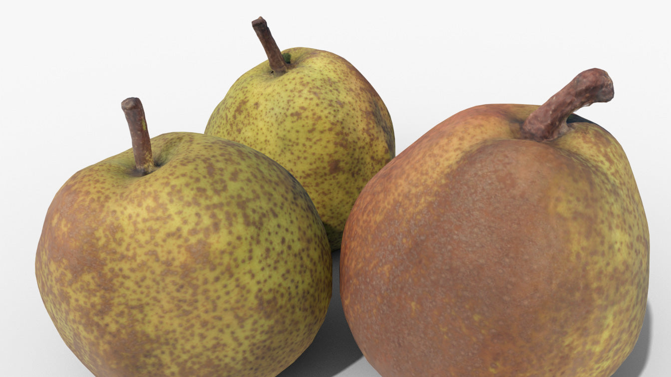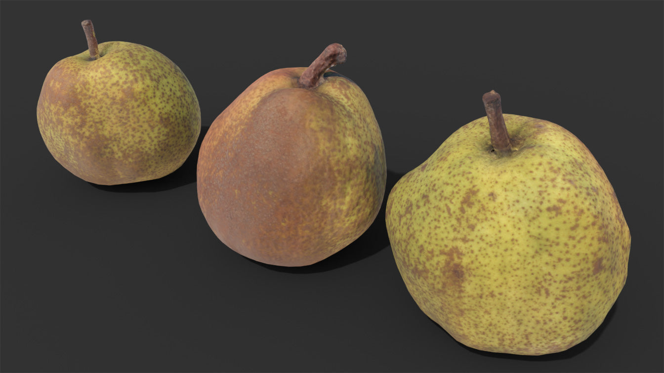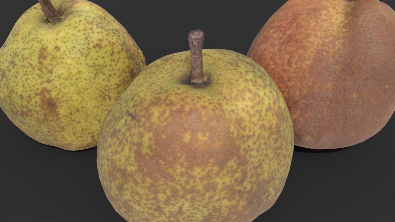 This is a digital 3D model of three La France pears. The pears have been scanned and retopologized from three different Japanese variety of Gold La France pears, and the resulting models have an excellent quality and detail, while maintaining a very small poly count.