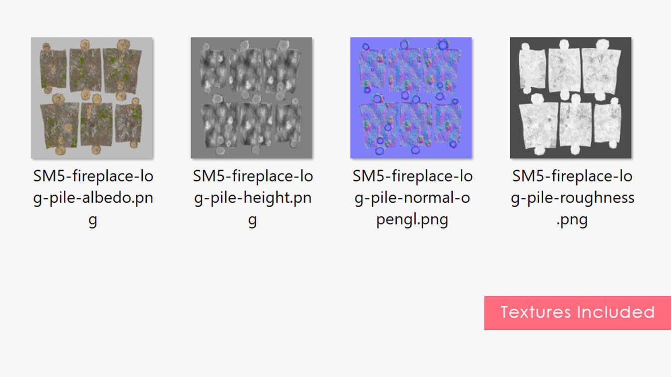 This is a digital 3D model of a pile of weathered logs for burning in the fireplace. These logs have been sitting outdoors for a while and are slightly moist and covered with moss.