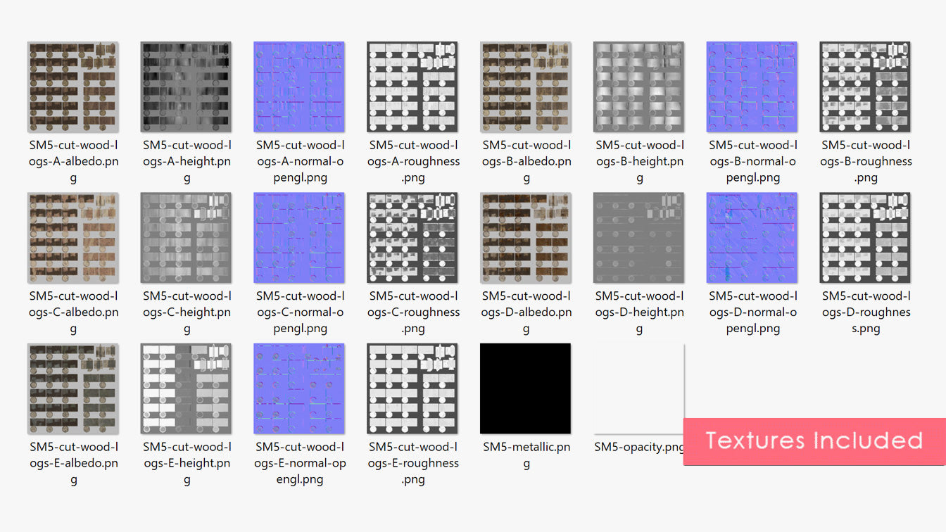 The product contains Albedo, Roughness, Height, Scattering and Normal map (OpenGL) textures for each material.