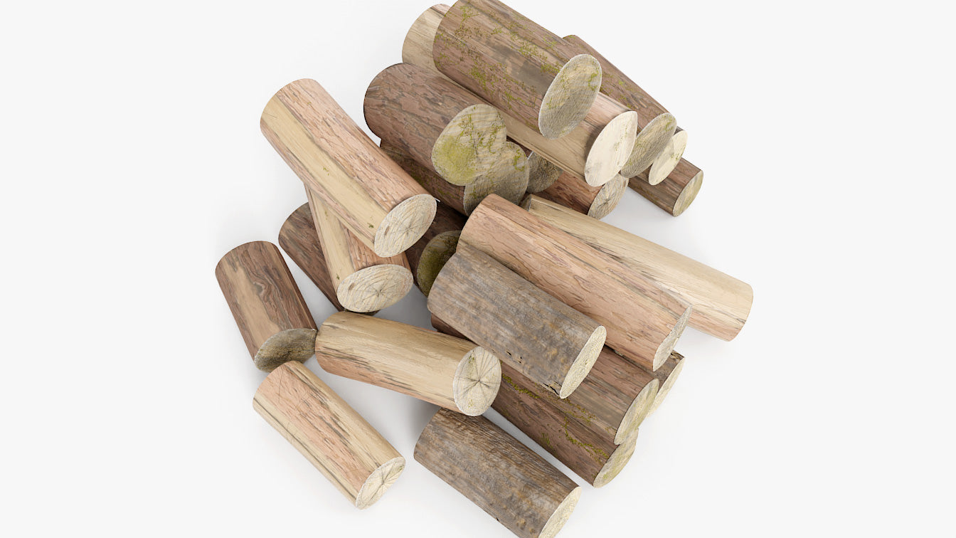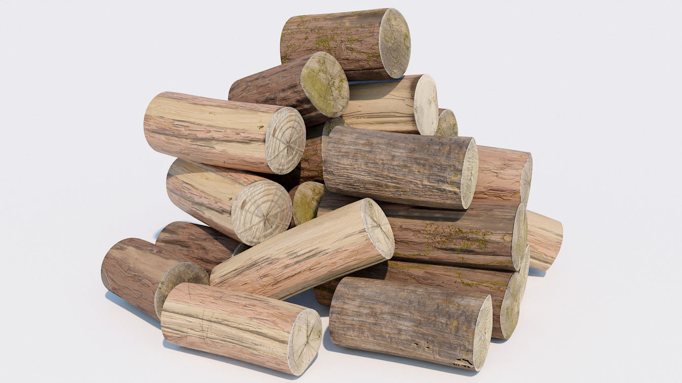 This is a digital 3D model of a pile of weathered logs for burning in the fireplace. These logs have been sitting outdoors for a while and are slightly moist and covered with moss.
