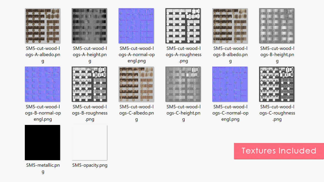 The product contains Albedo, Roughness, Height, Scattering and Normal map (OpenGL) textures for each material.