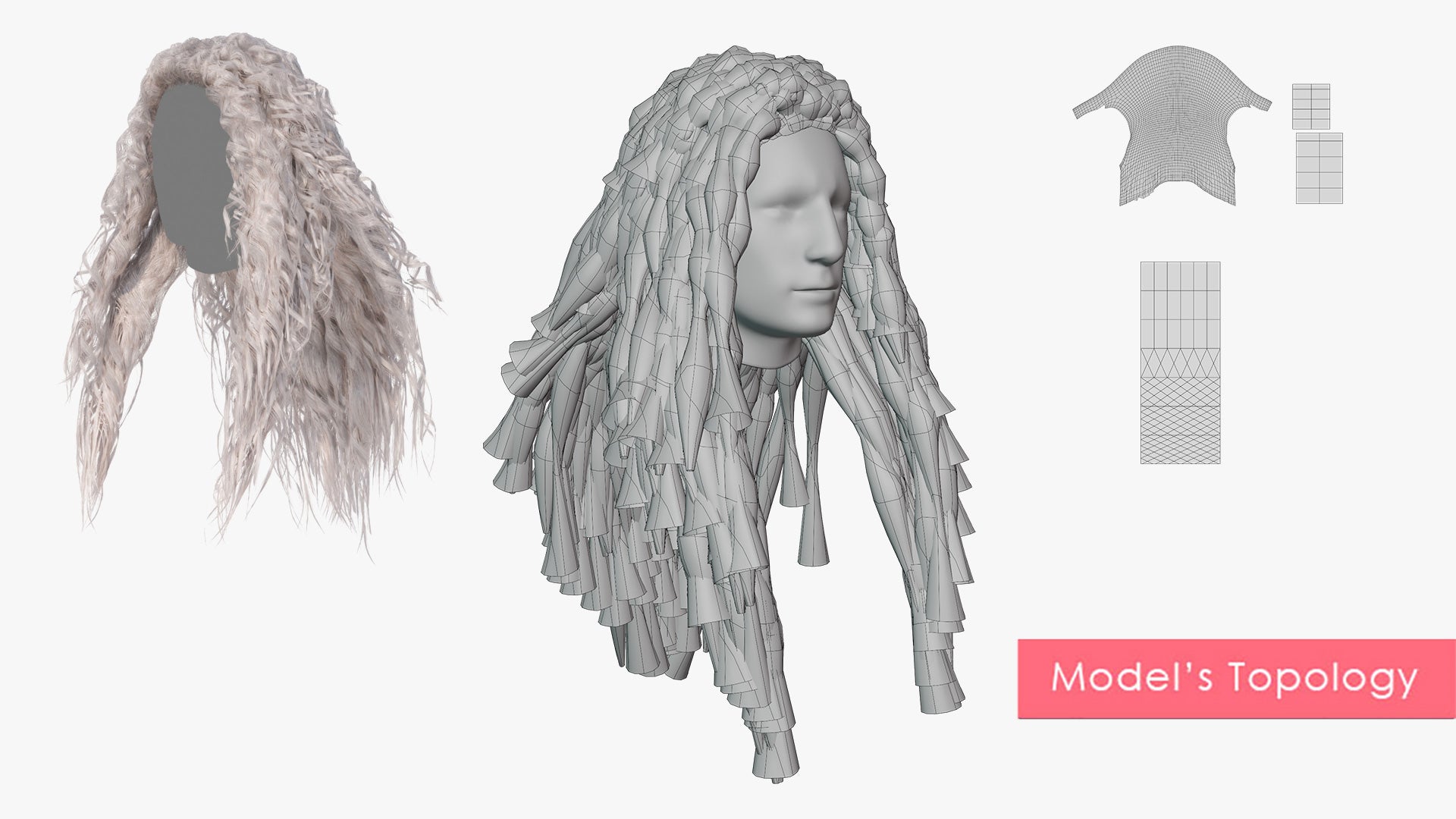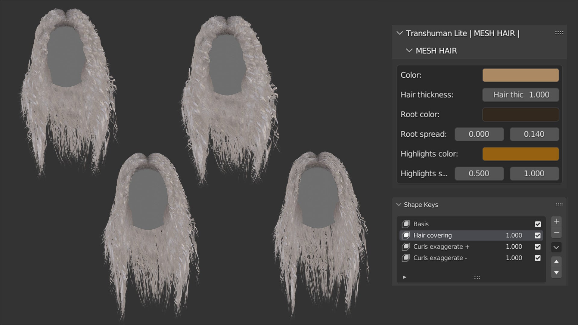 The model also includes three shape keys to further customize the shape and feel of the hairstyle, to extend the hair covering, and to exaggerate the curls.