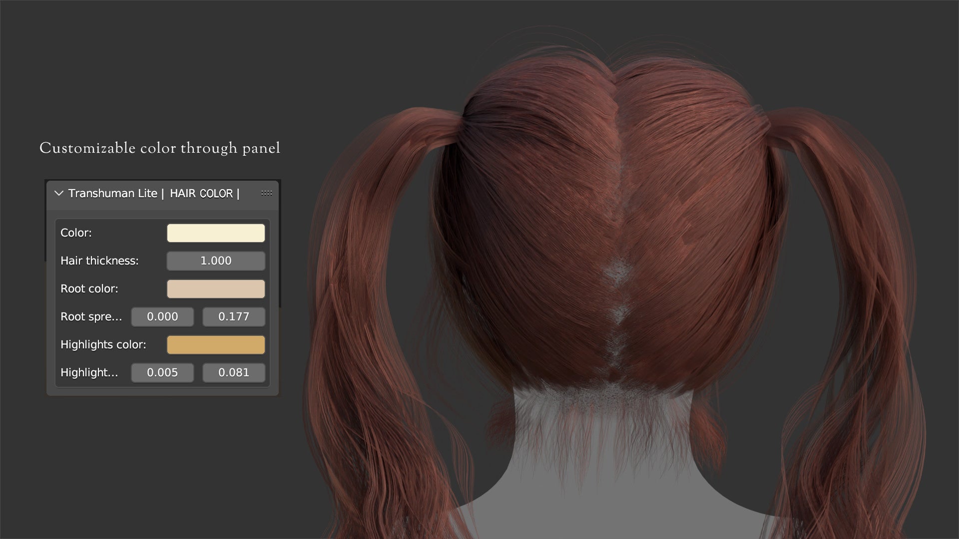 This hairstyle can be easily customized to any color though the Transhuman Lite - HAIR COLOR panel included.