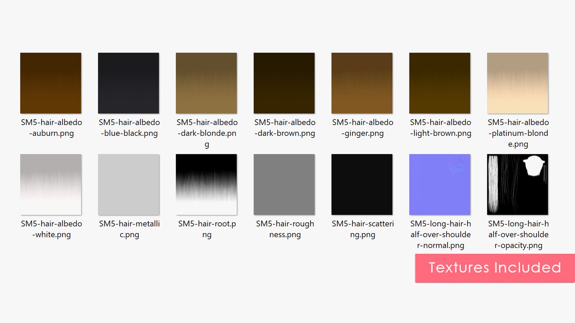 The product contains Albedo, Roughness, Metallic, Scattering, Root Mask, Opacity and Normal map (OpenGL) textures for each material.