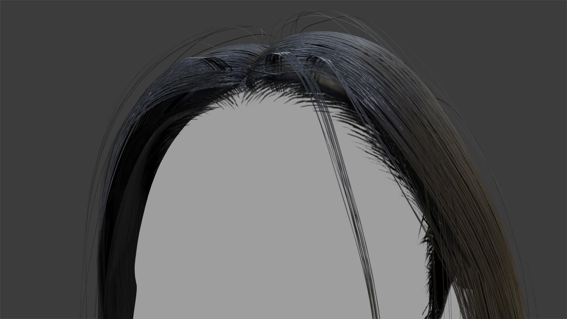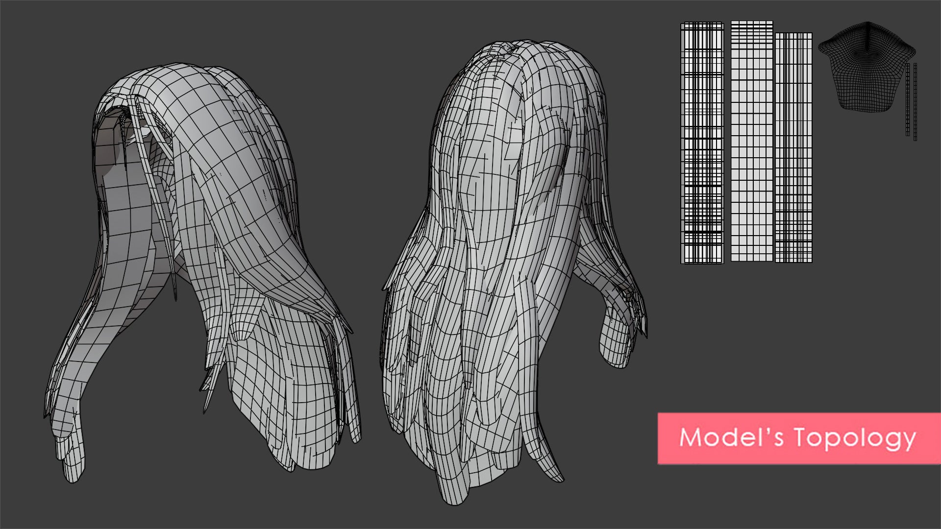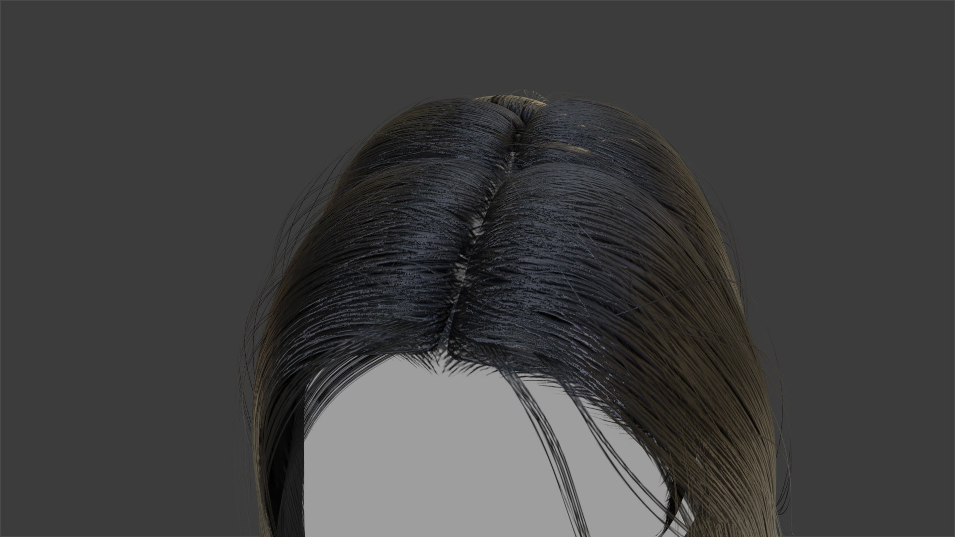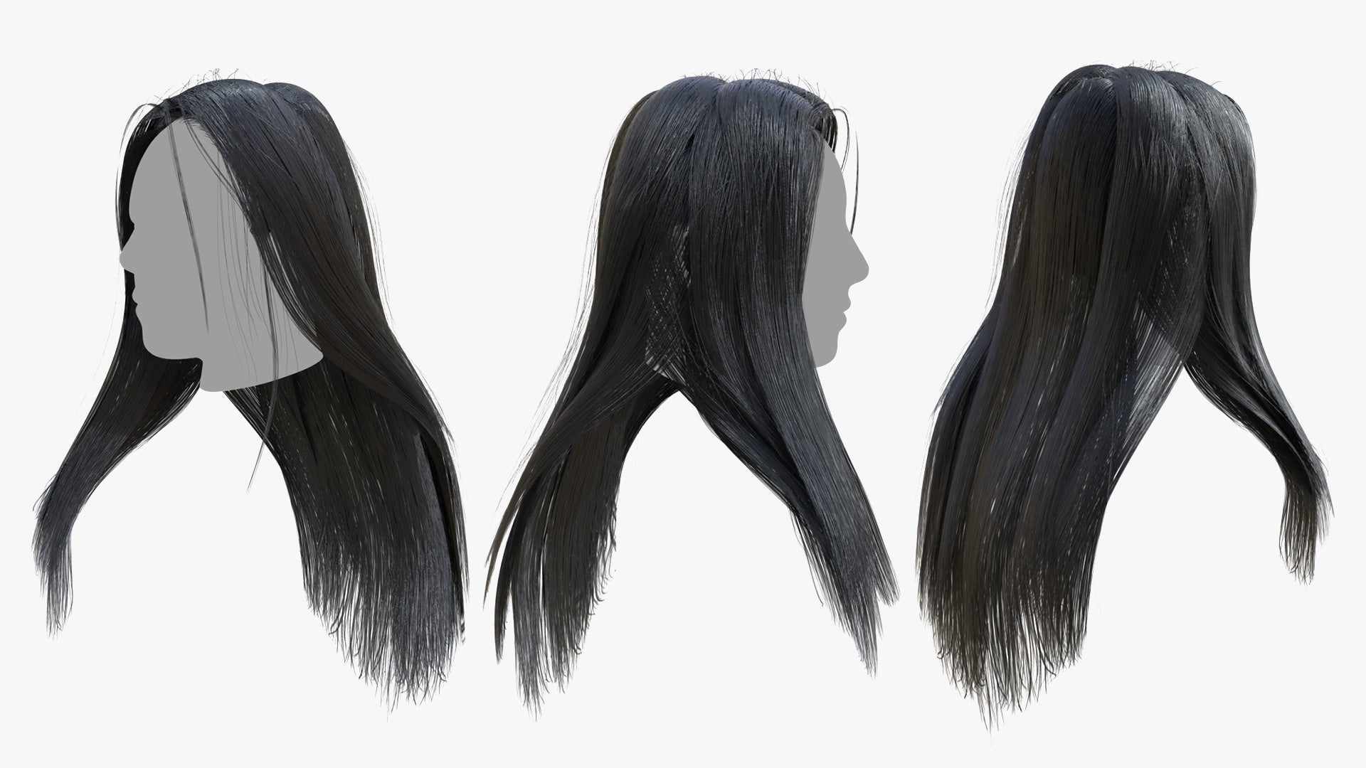 This is a digital 3D model of a long hairstyle with a portion of it over the right shoulder. The hair is modeled by mesh cards, and has a very low poly count. The result is perfect for background characters, and it can be animated using cloth dynamics to achieve an amazing effect.