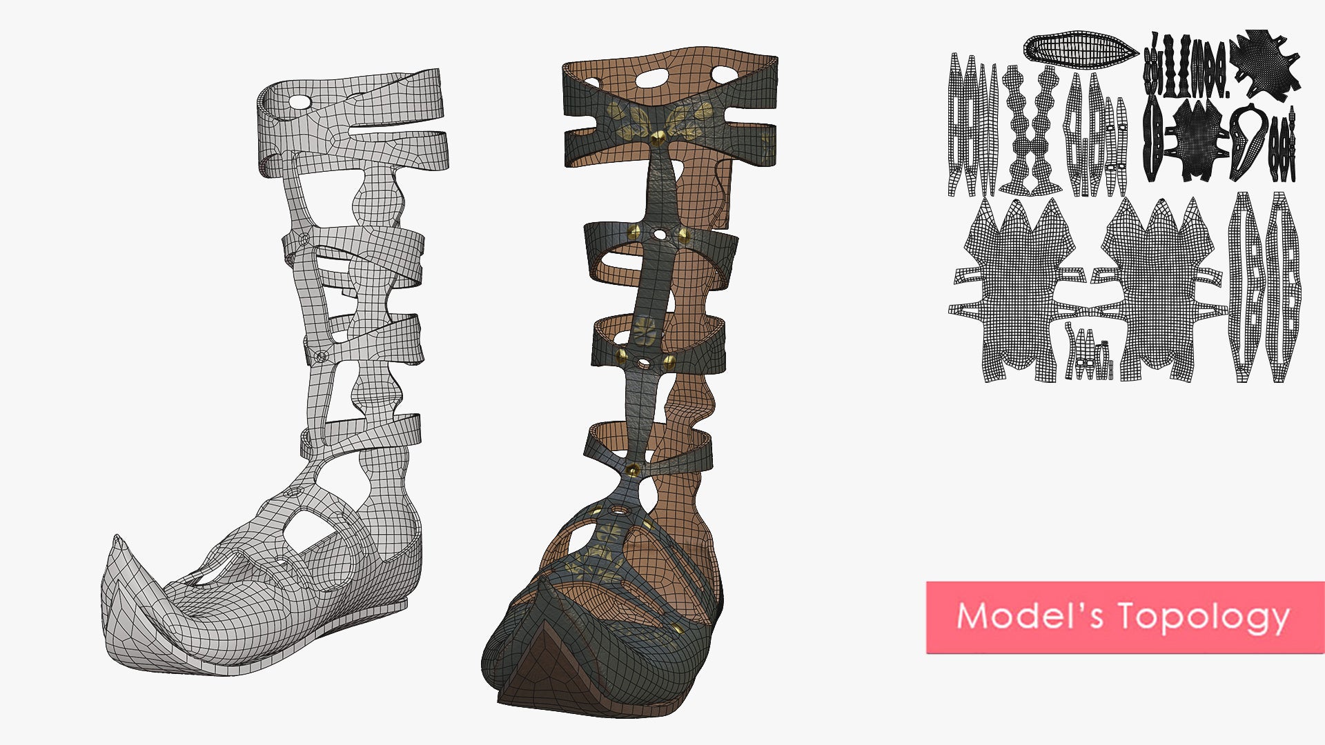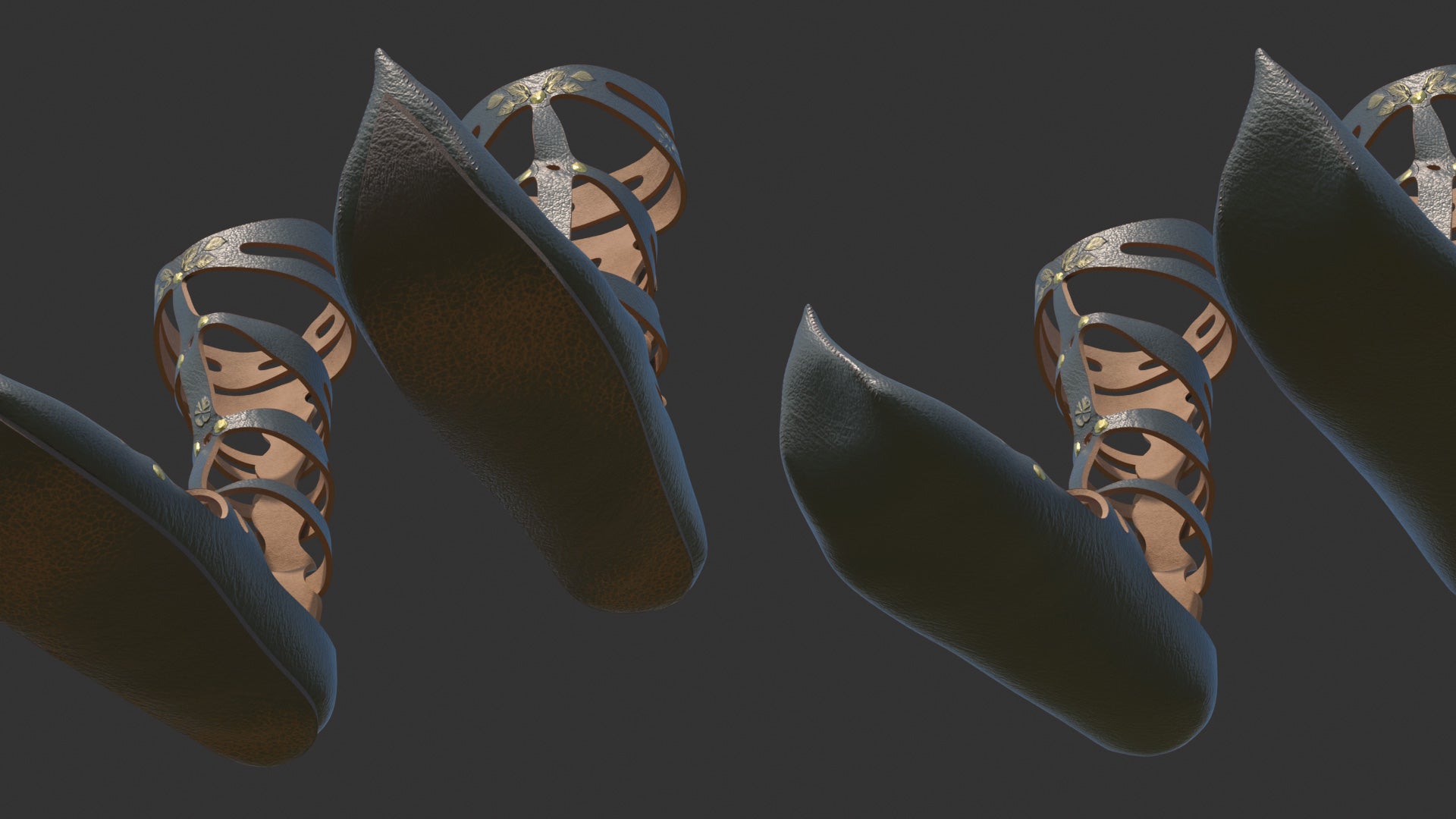 This is a digital 3D model of a shoe design, inspired by the sandals worn in Greece and ancient Rome, but with the pointy tips of the medieval shoes.