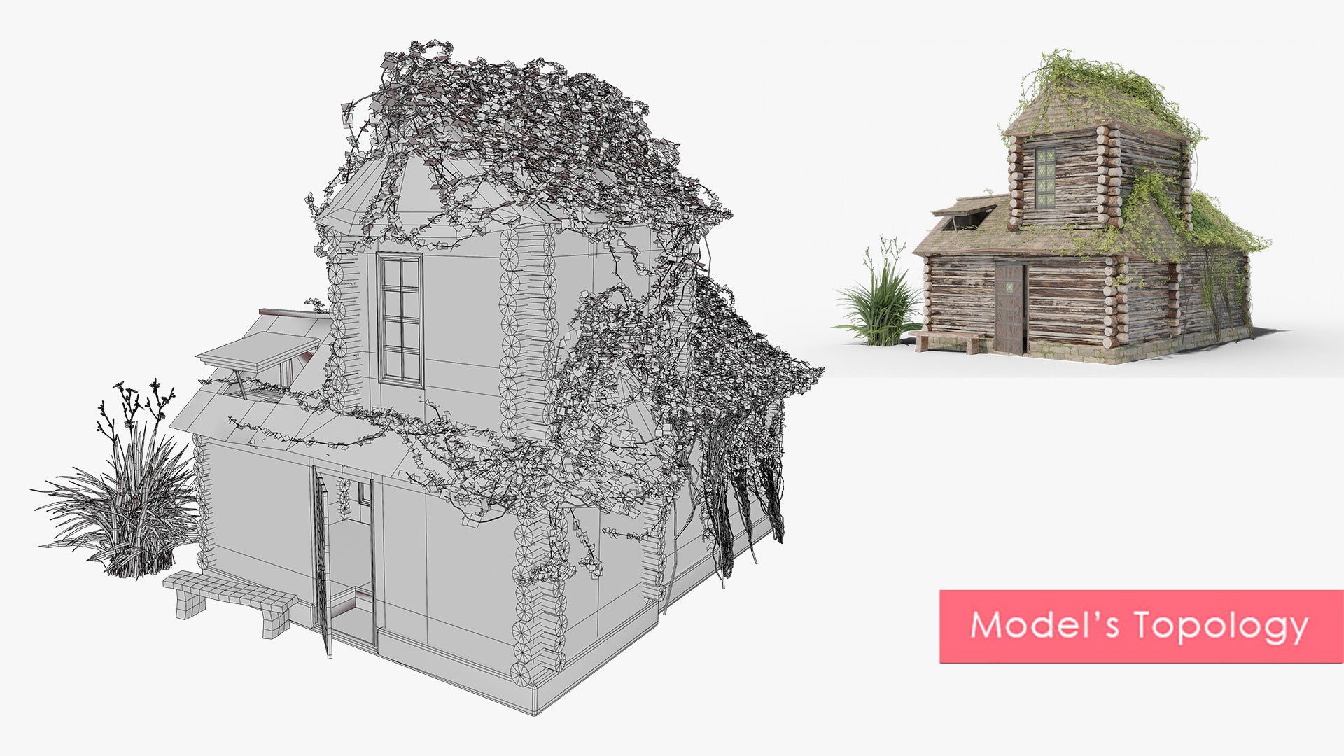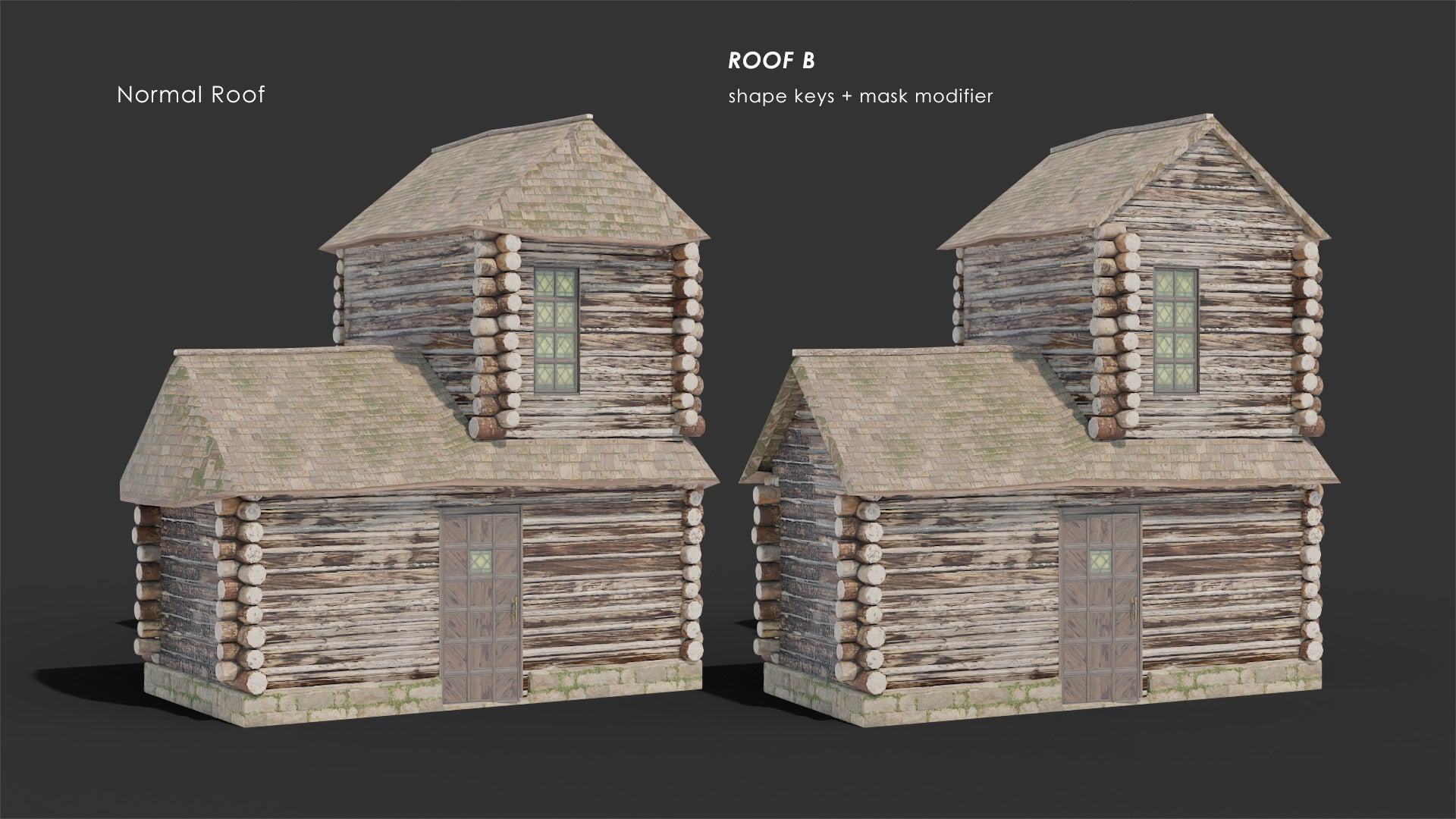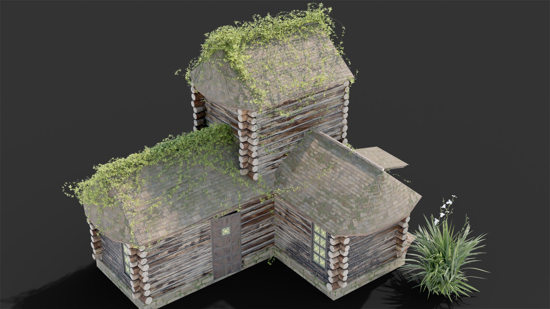 The roof is built with weathered wooden shingles. For further realism the roof is covered in creeping ivy.