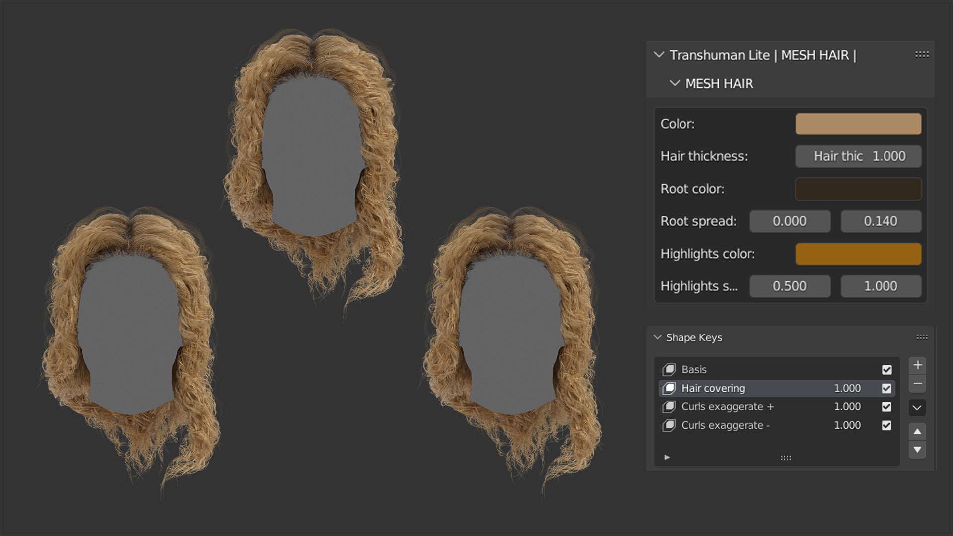The model also includes three shape keys to further customize the shape and feel of the hairstyle, to extend the hair covering, and to exaggerate the curls.