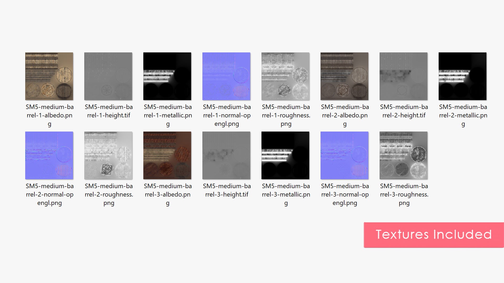 The product contains Albedo, Metallic, Roughness, Height, and Normal map (OpenGL) textures.