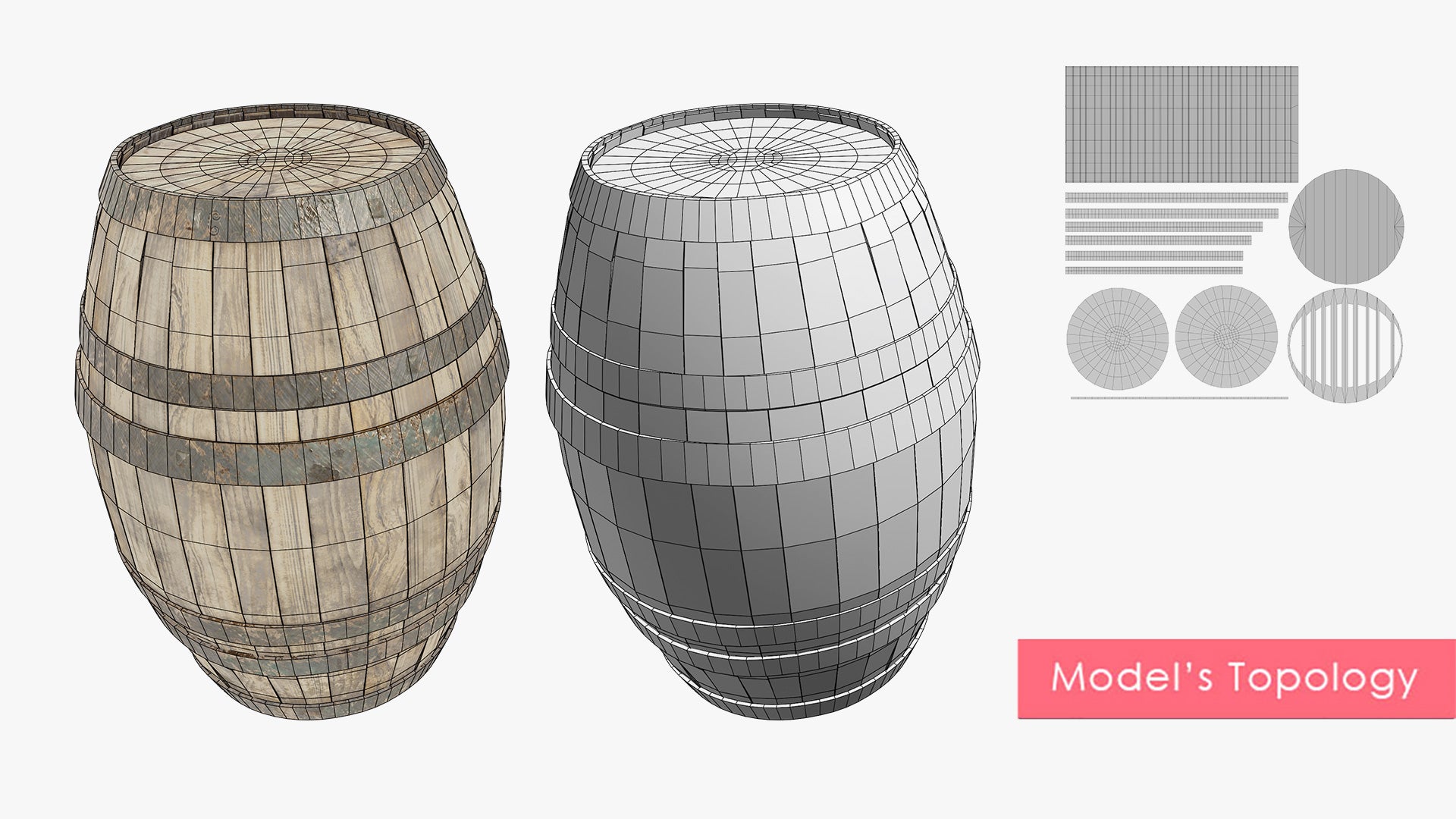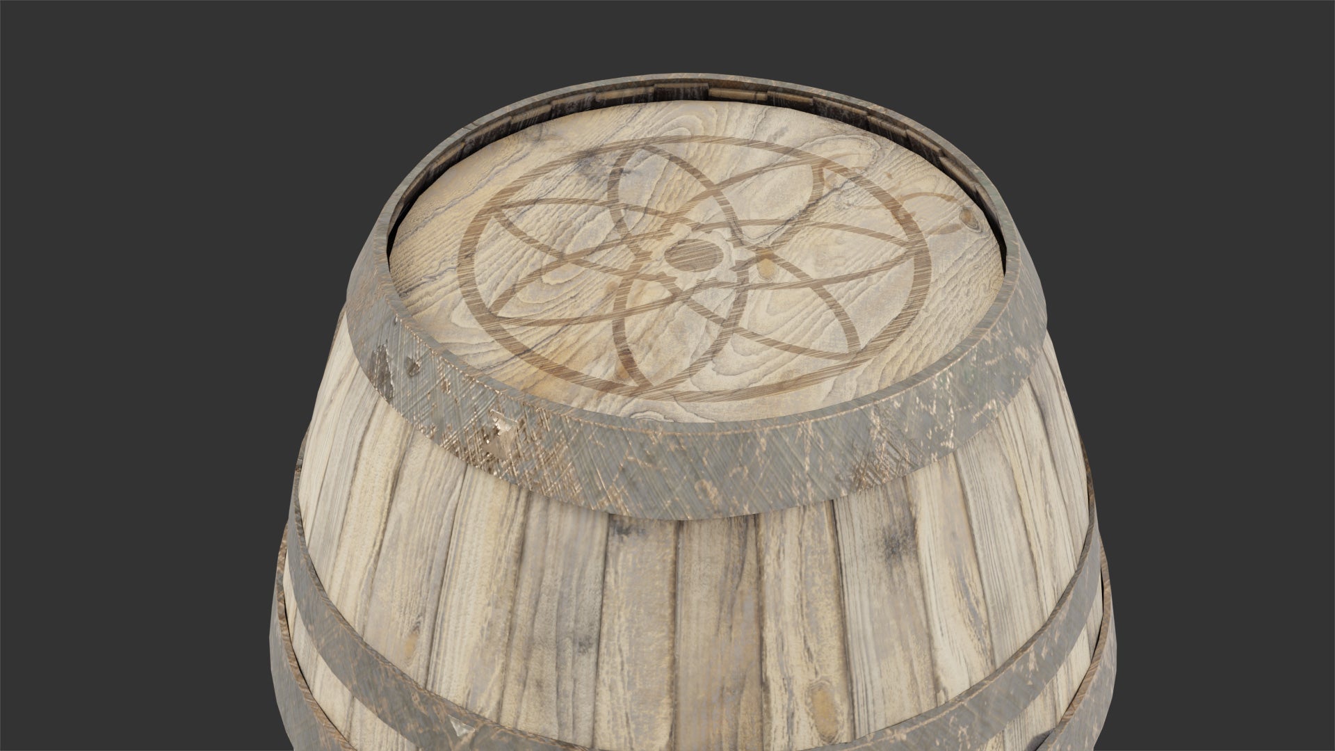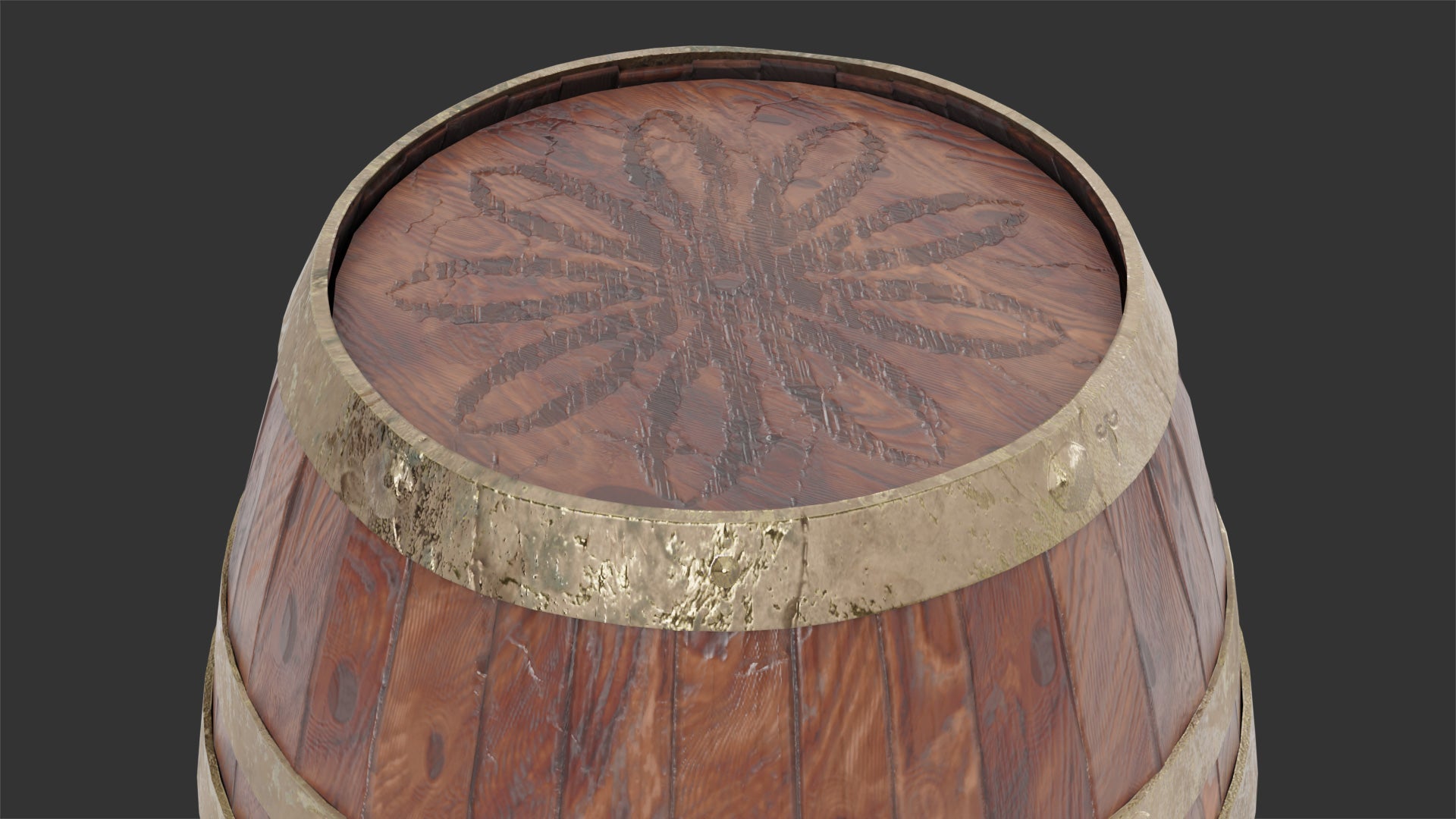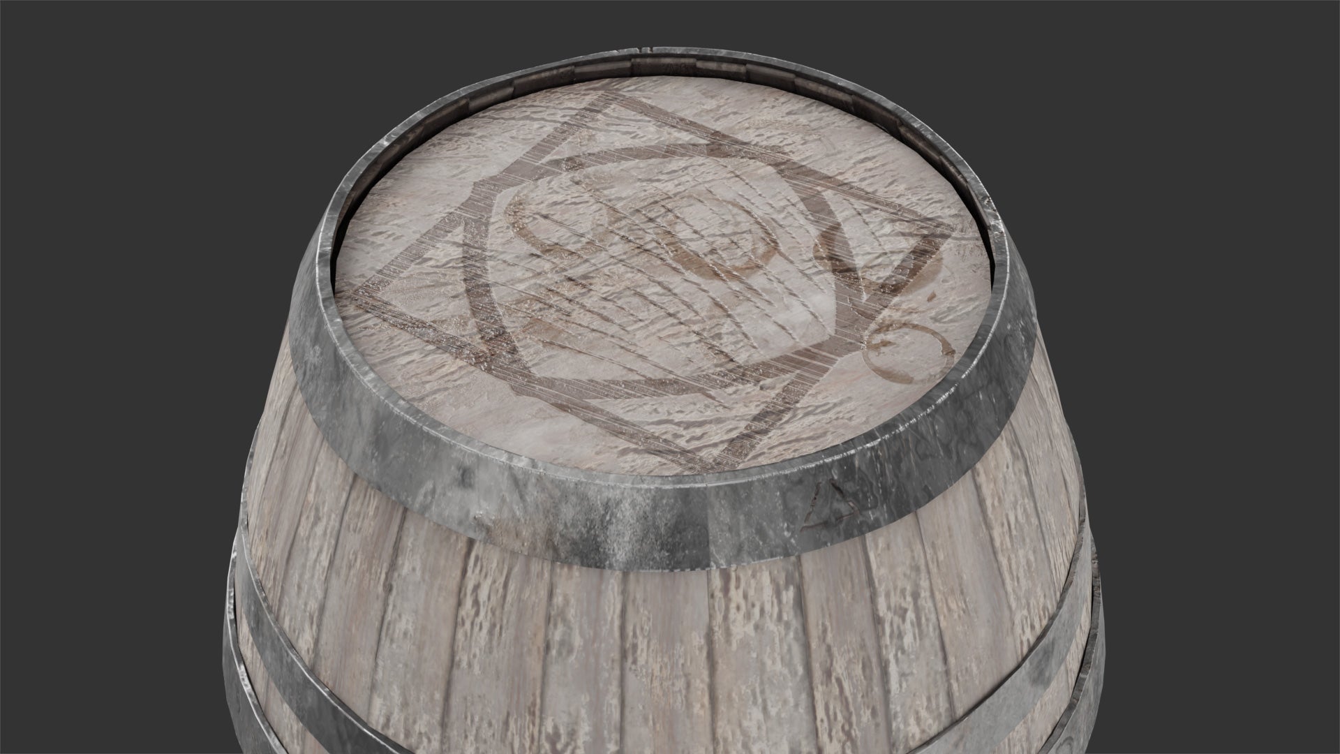 This is a digital 3D model of an old style medium sized barrel. The barrel has a decorated lid that is made of a whole plank of polished wood. The bottom of the barrel is made of multiple planks. They can be switched to add additional variation.