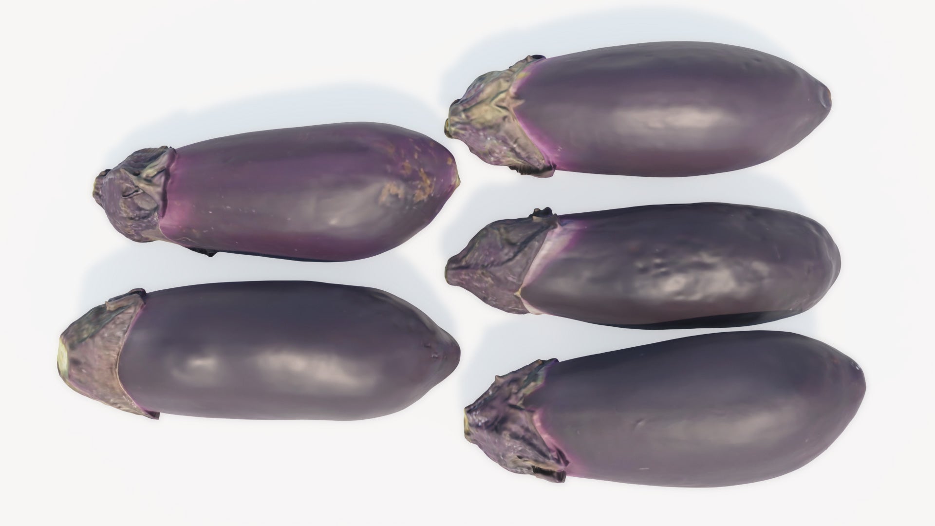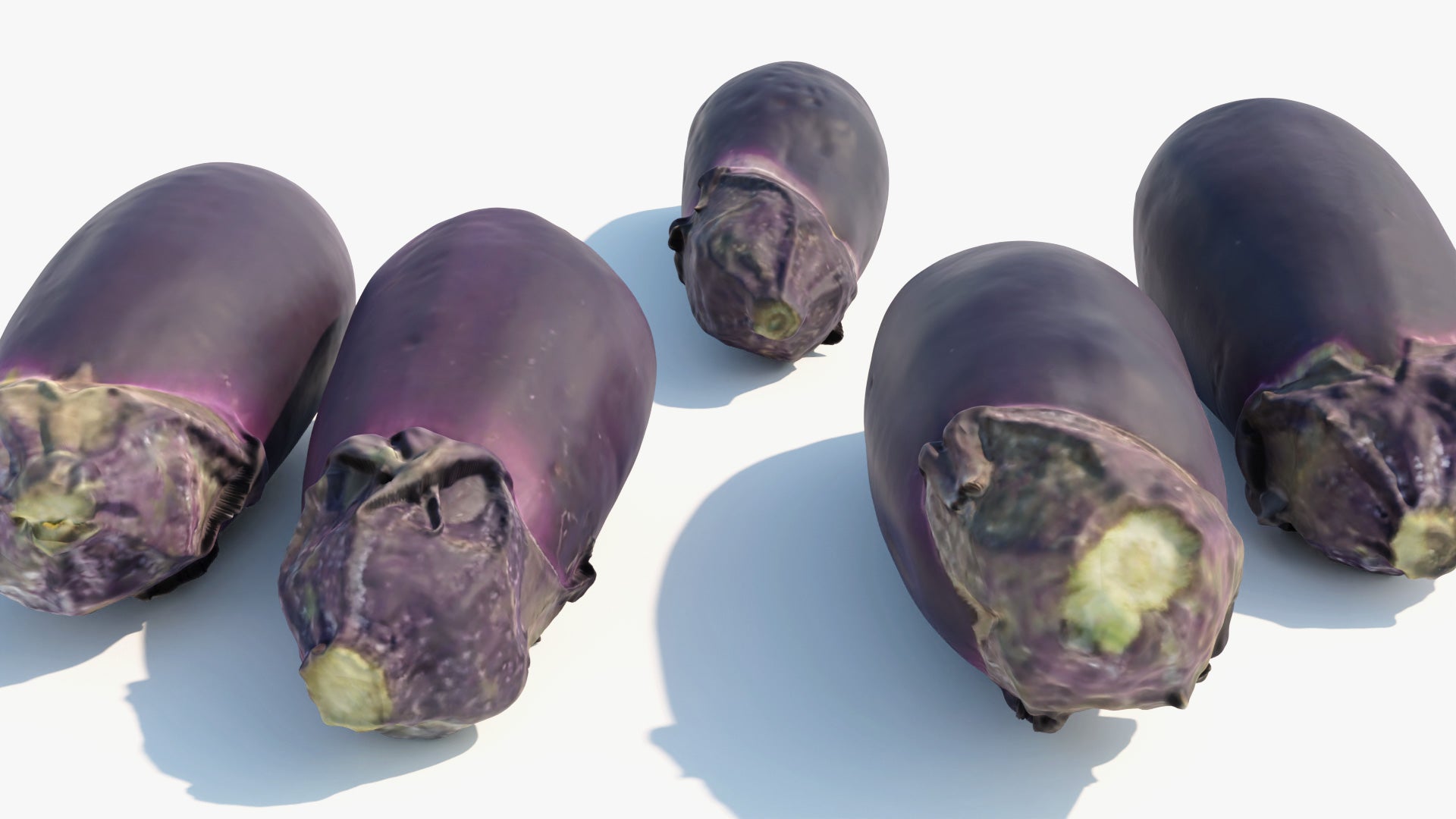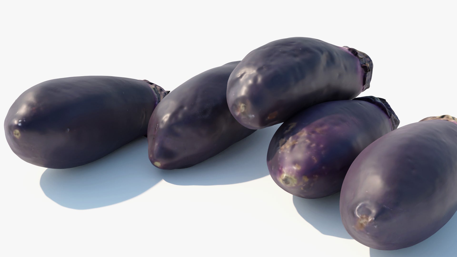 This is a digital 3D model of five nasu eggplants (Japanese variety). The eggplants have been scanned and retopologized from five different fruits, and the resulting models have an excellent quality and detail, while maintaining a very small poly count.