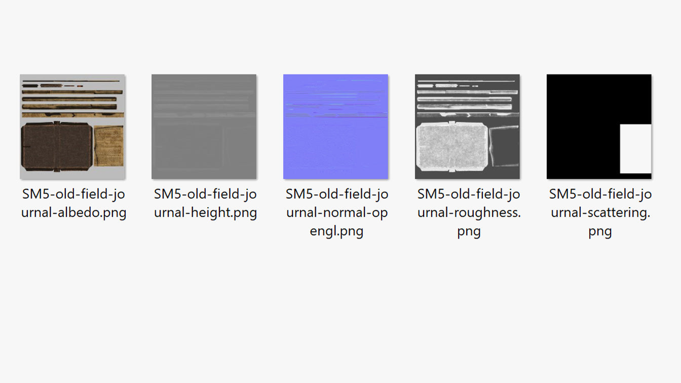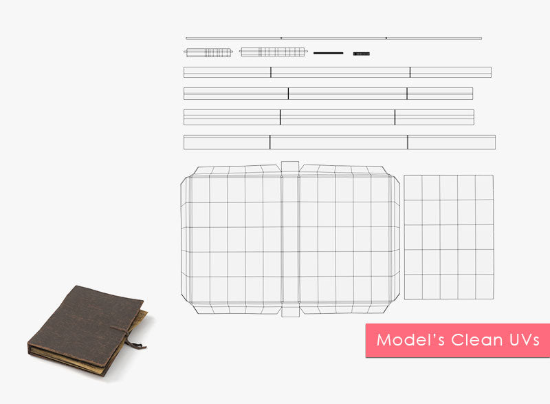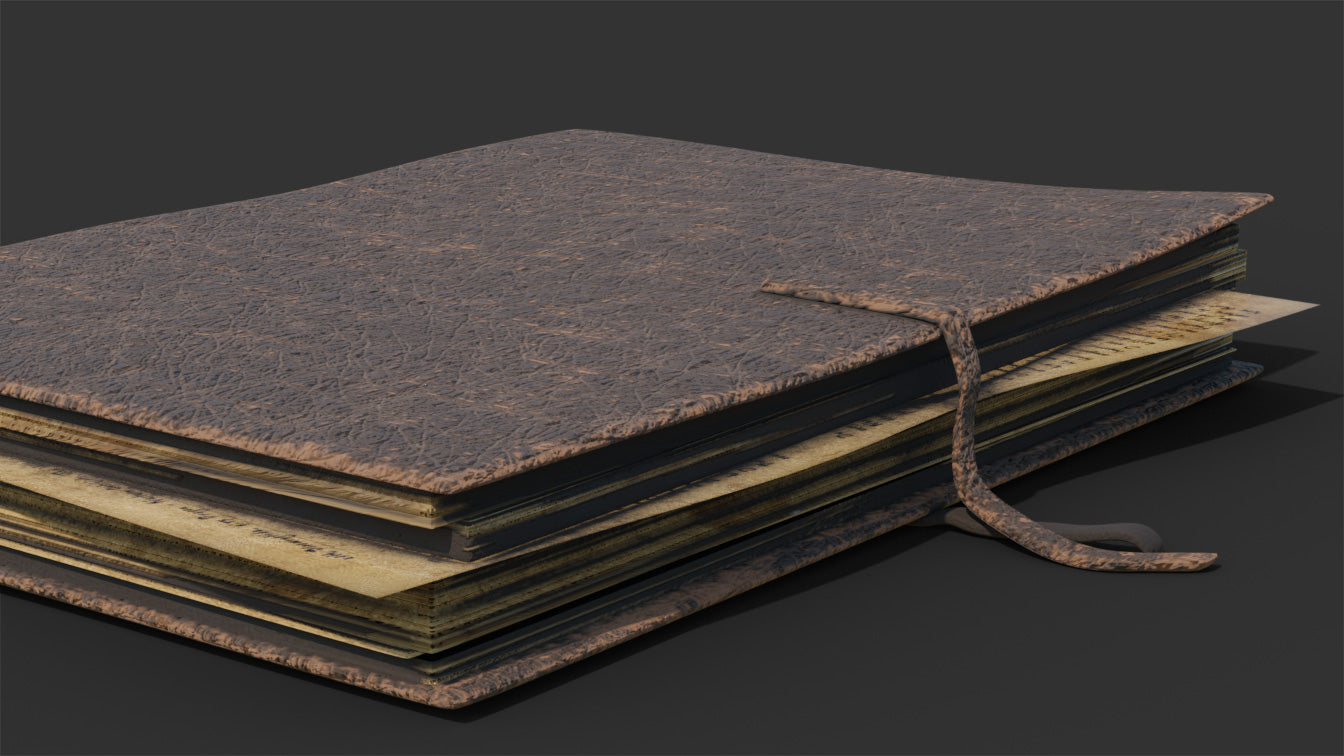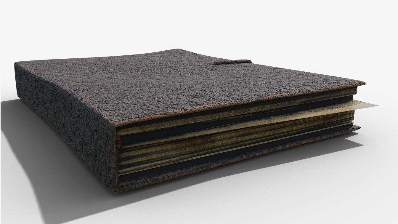 This is a digital 3D model of an old field journal (or a diary), made of pig skin leather and parchment paper. The leather is worn out by use and the environmental conditions of the road.