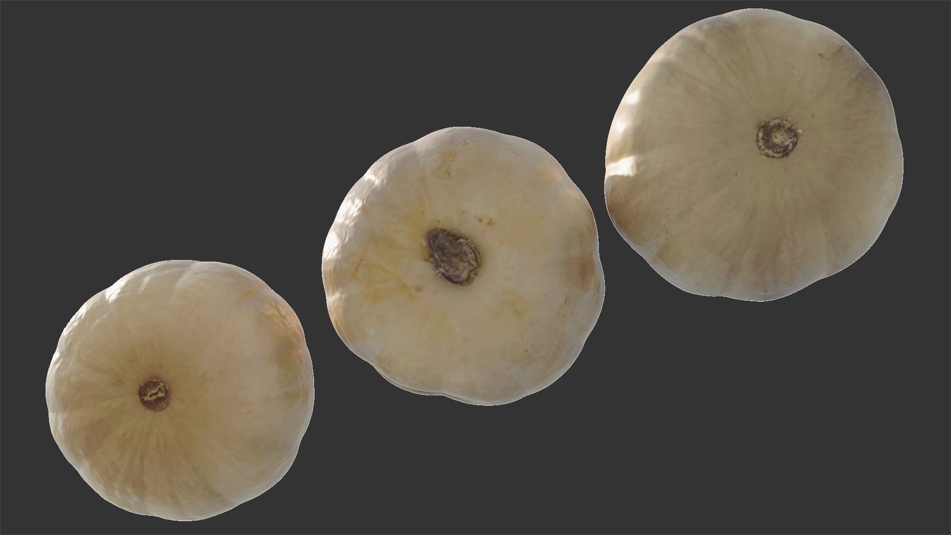 This is a digital 3D model of three orange pumpkins. The pumpkins have been scanned and retopologized from three different fruits, and the resulting models have an excellent quality and detail, while maintaining a very small poly count.