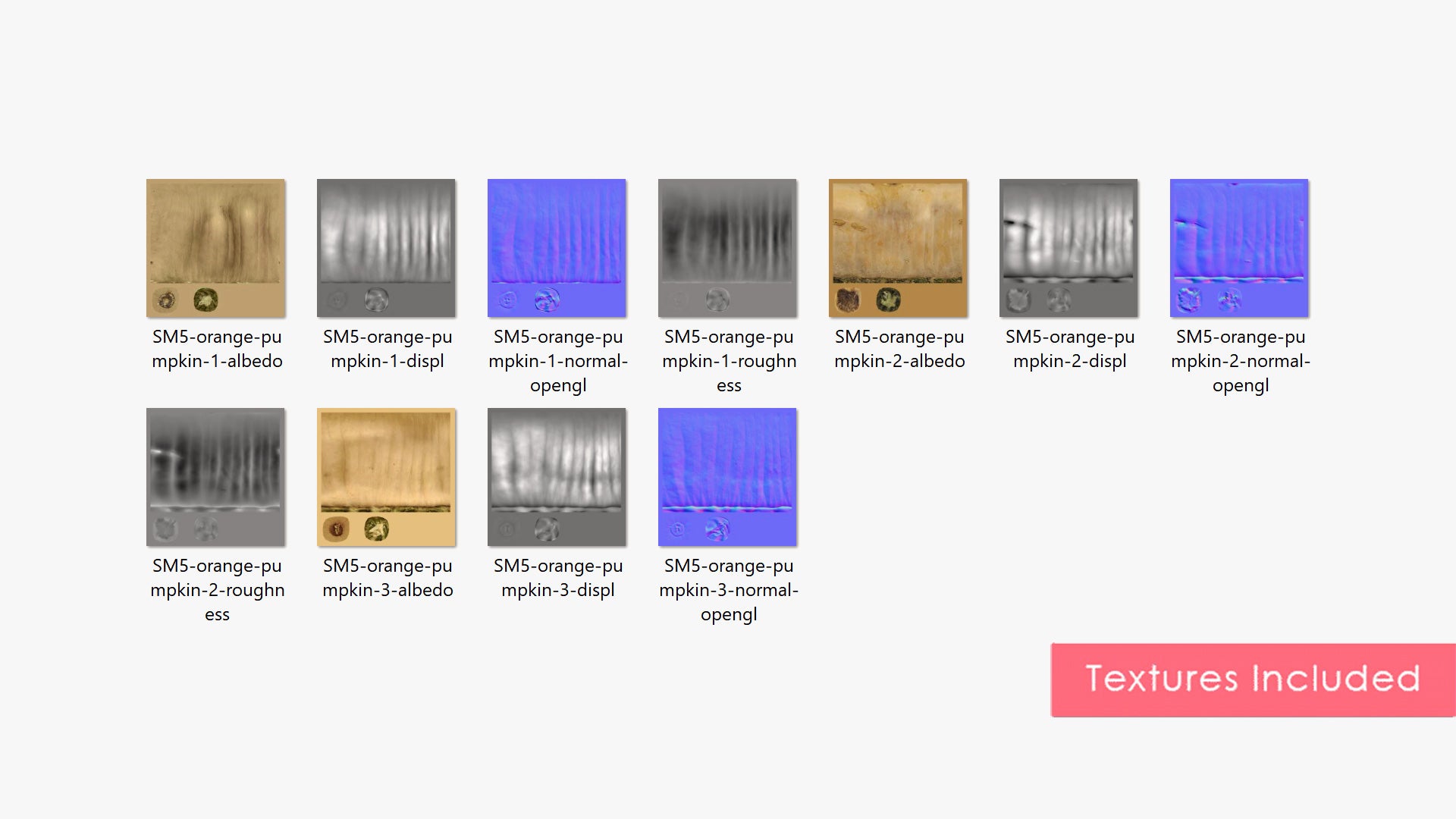 The textures can be interchanged between the models, allowing for a great variety of pumpkins. They can also be exchanged with the materials from our products Halloween Pumpkins and Green Japanese Pumpkins for an even greater variety!