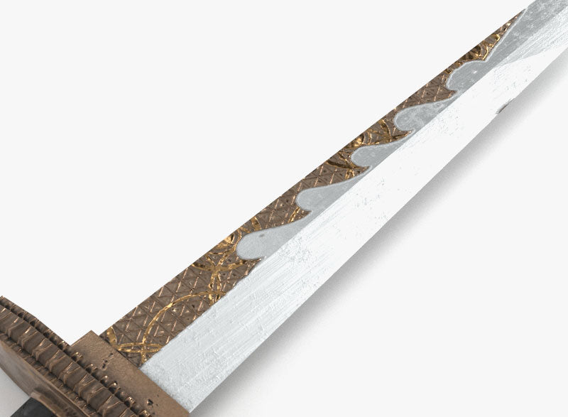 This is a digital 3D model of an antique ornamental dagger. The dagger’s blade is decorated with a gold inlay, that covers the length of the blade till the point. This dagger’s design takes inspiration from the eighteen-century Afghan Pesh Kabz ornamental blades. The rain-guard (chappe), cross-guard and pommel are all made of bronze and have a geometrical pattern embossed. The grip is made of black leather, textured in the form of dragon scales.