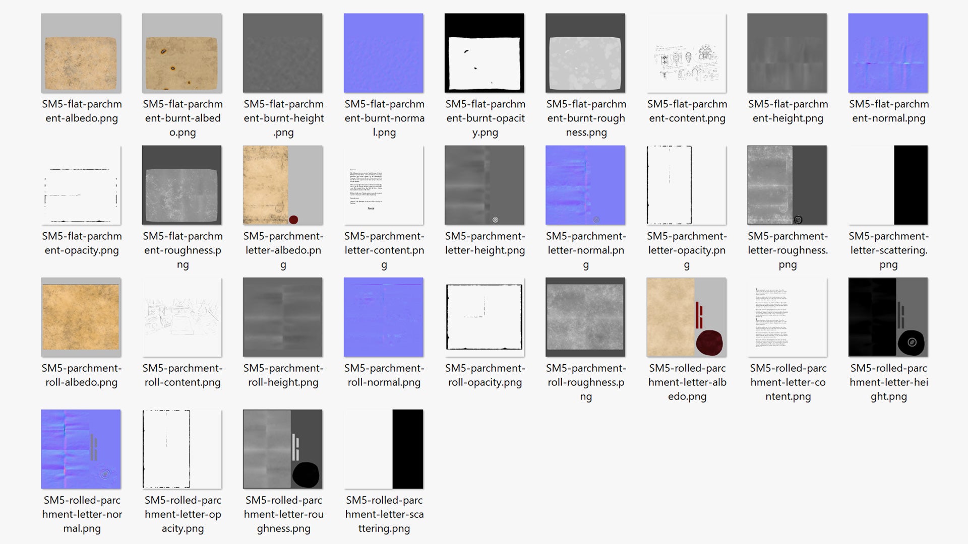 The product contains Albedo, Roughness, Height, Scattering, Custom Content and Normal map (OpenGL) textures for each material.