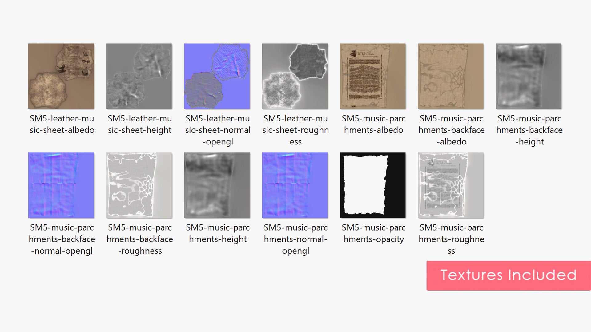 This is a digital 3D model of a set of two antique parchments: one is made of worked leather and holds the lyrics of the song 'The Tall Stranger", and the other is a wrinkled parchment with the fantasy chord progression for a Tranglar and two flutes. The resulting models have a beautiful, rustic feel, and they have excellent quality and detail, while maintaining a very small poly count.