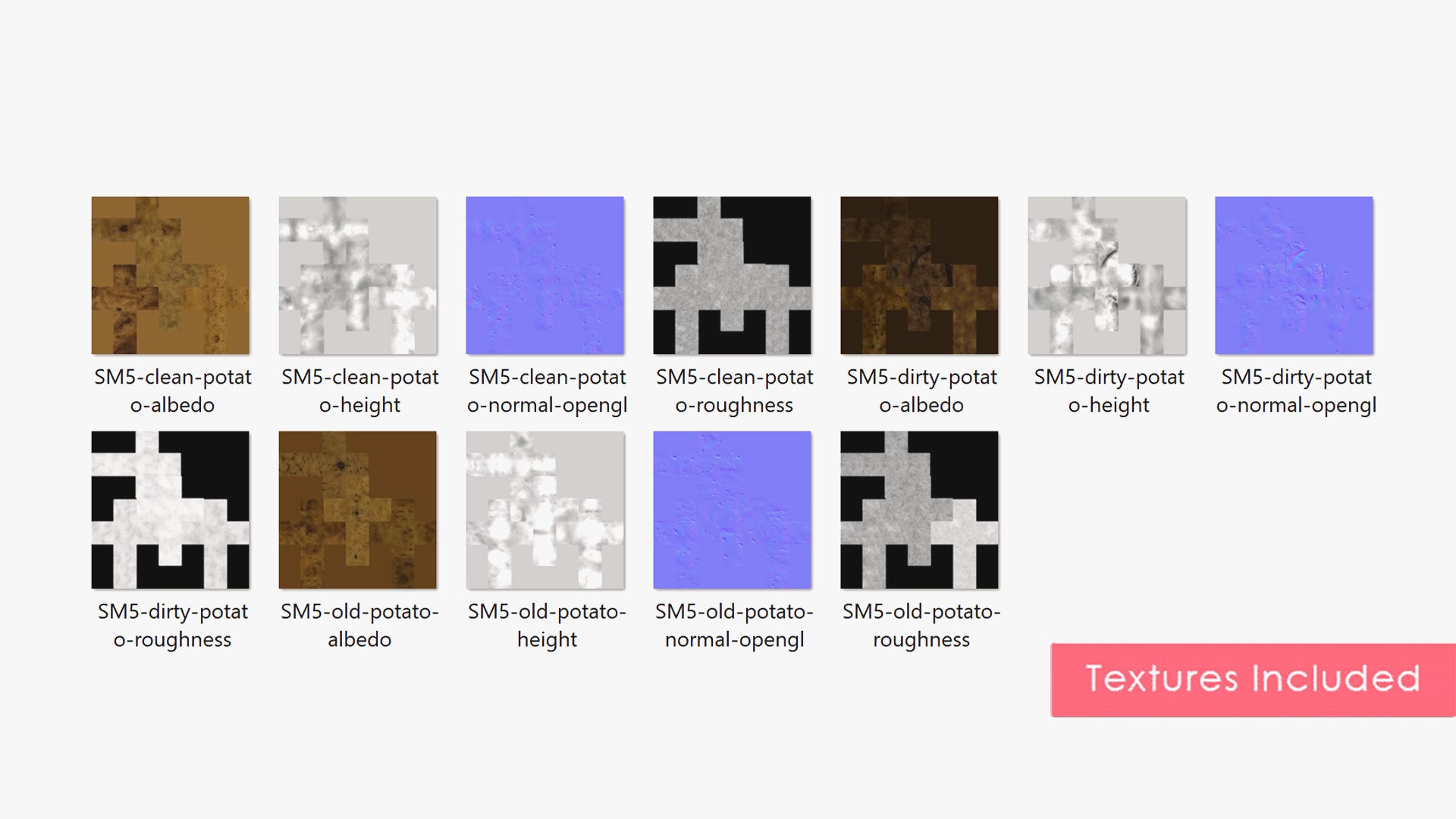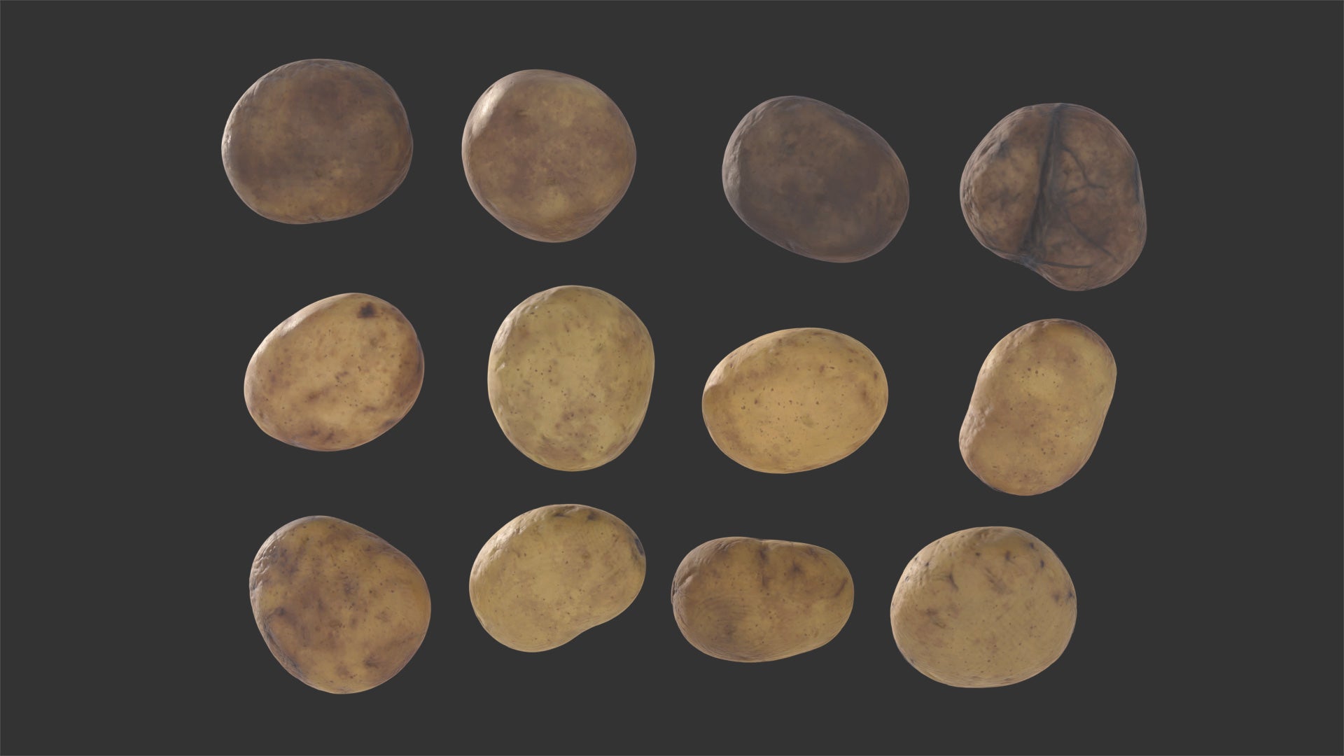 This is a digital 3D model of a group of 12 potatoes. They come with three different materials: Clean, Dirty and Old, which are inter exchangeable for a great variety of potatoes!
