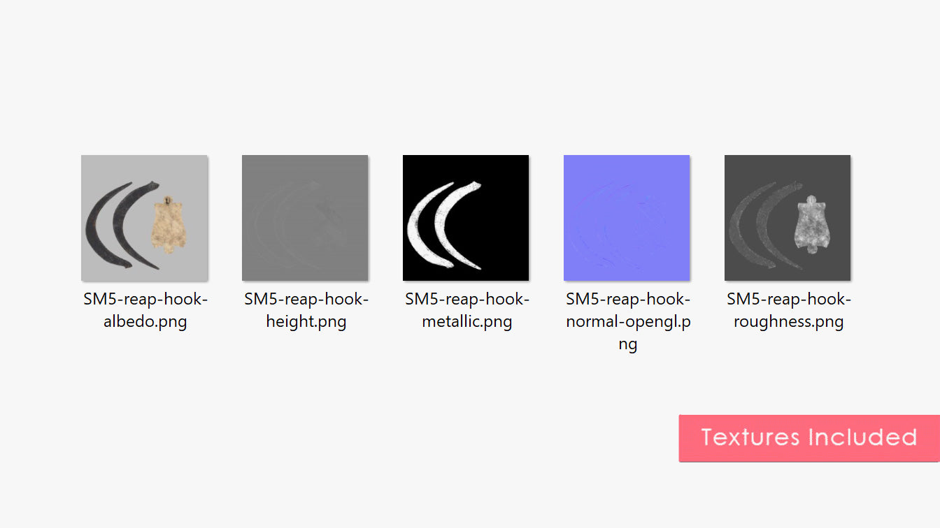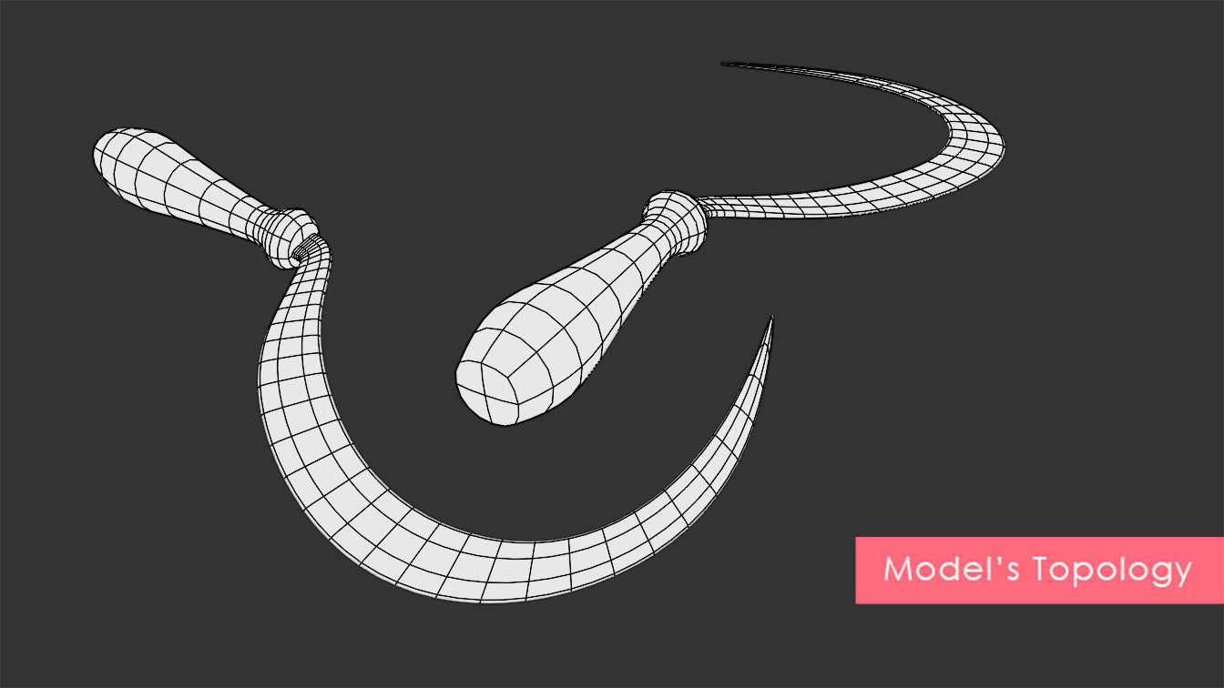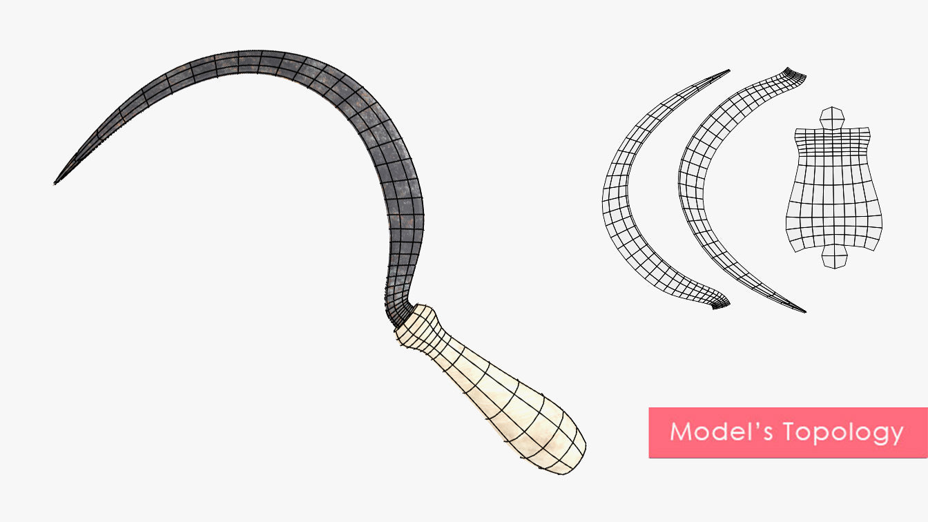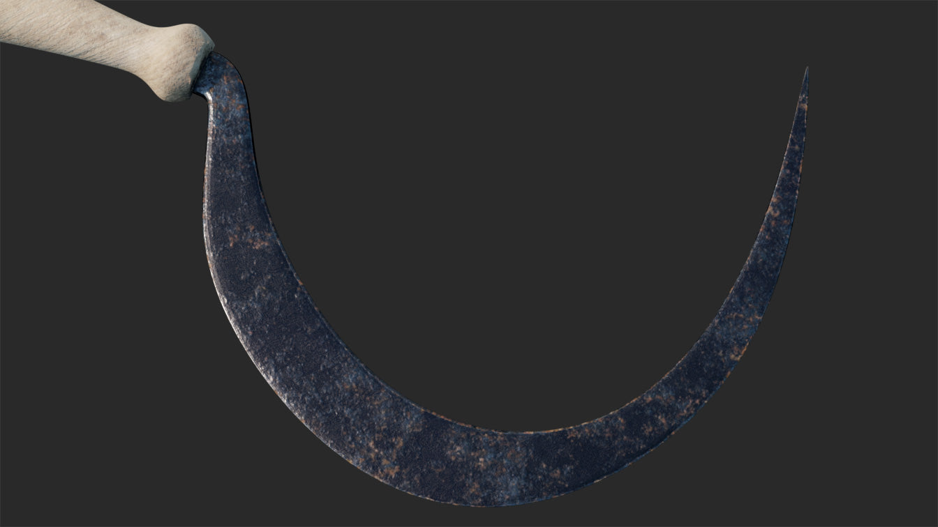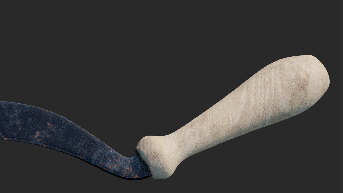 This is a digital 3D model of an antique reap hook. The blade is made of rough iron, oxidized and weather after extensive use in the field. The handle is untreated pine wood. The handle presents some damaged due to use, but it's in good, clean condition.