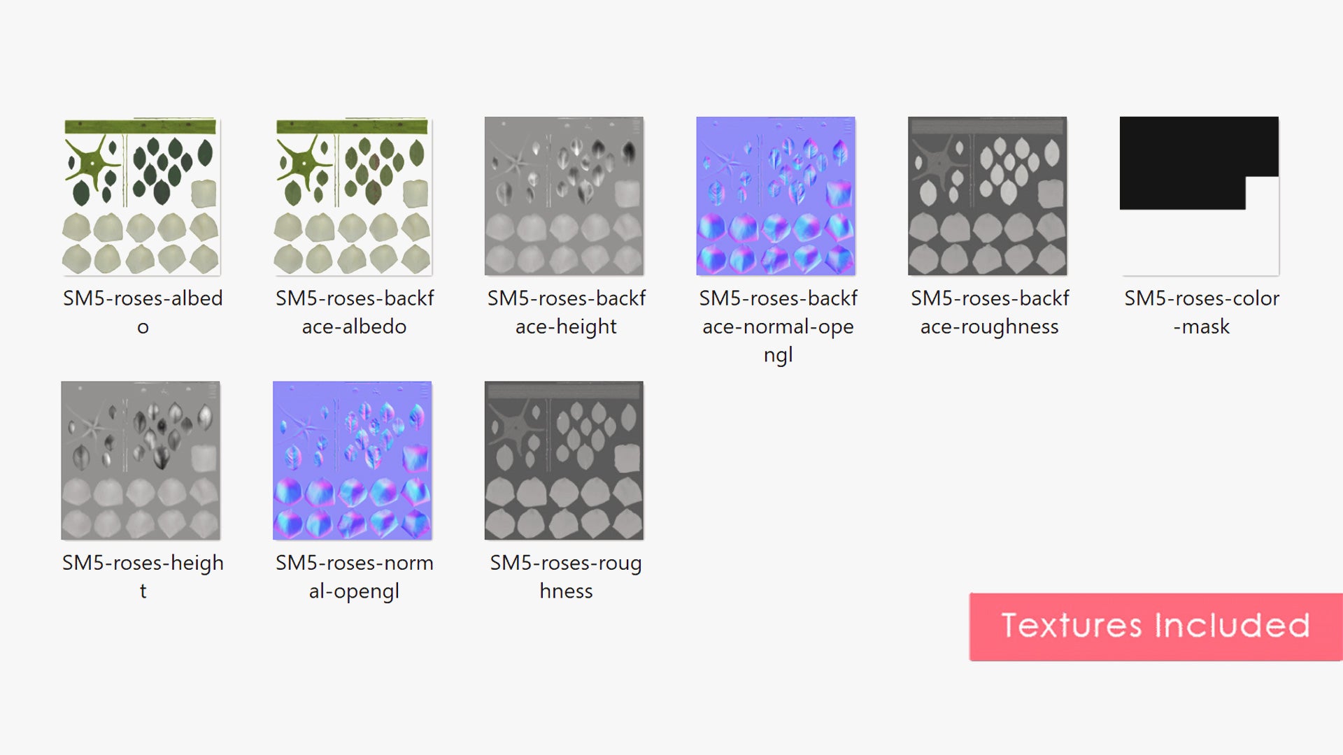 - Product format files are Blender; FBX, GLB (for a sample rose); and PNG and TIF for the images.