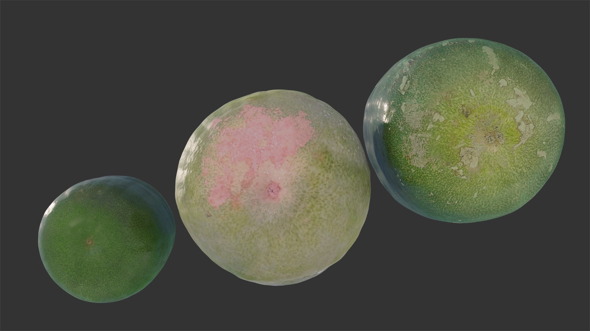 This is a digital 3D model of three Japanese tougans (wax gourd, winter melon). The tougans have been scanned and retopologized from three different fruits, and the resulting models have an excellent quality and detail, while maintaining a very small poly count.